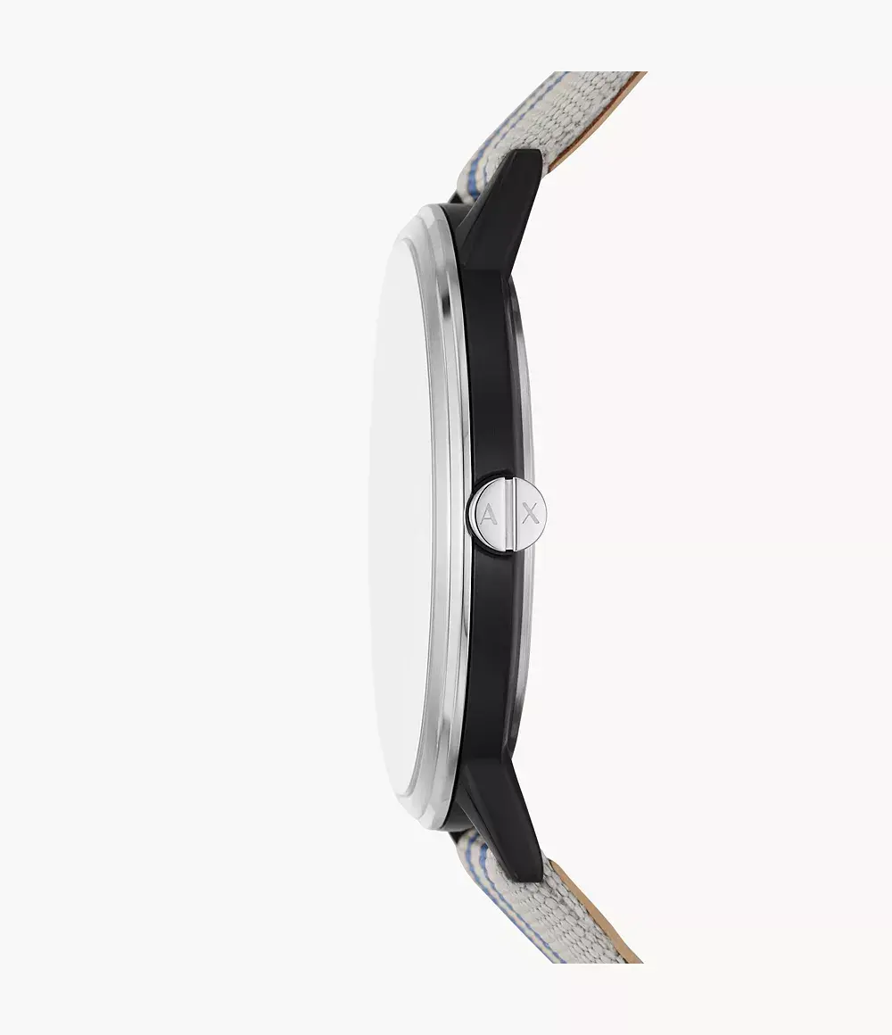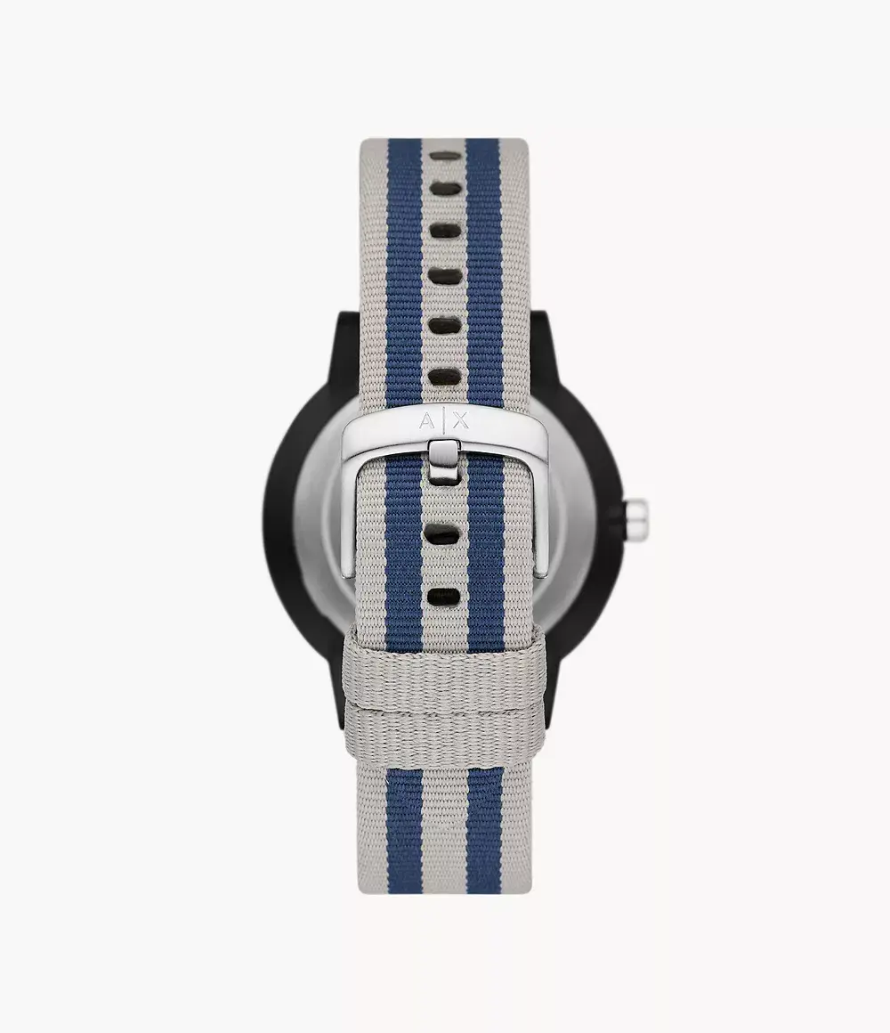 Мужские кварцевые аналоговые наручные часы. Центральные часовая, минутная и секундная стрелки. Серый циферблат с часовыми метками в виде штрихов. Круглый стальной корпус с покрытием чёрного цвета. Стальной безель серебристого цвета. Диаметр корпуса 42 мм. Рифленая переводная головка. Устойчивое к мелким механическим повреждениям минеральное стекло. Двухцветный текстильный ремешок с классической застёжкой buckle. Водозащита 50WR (мытьё рук, дождь).