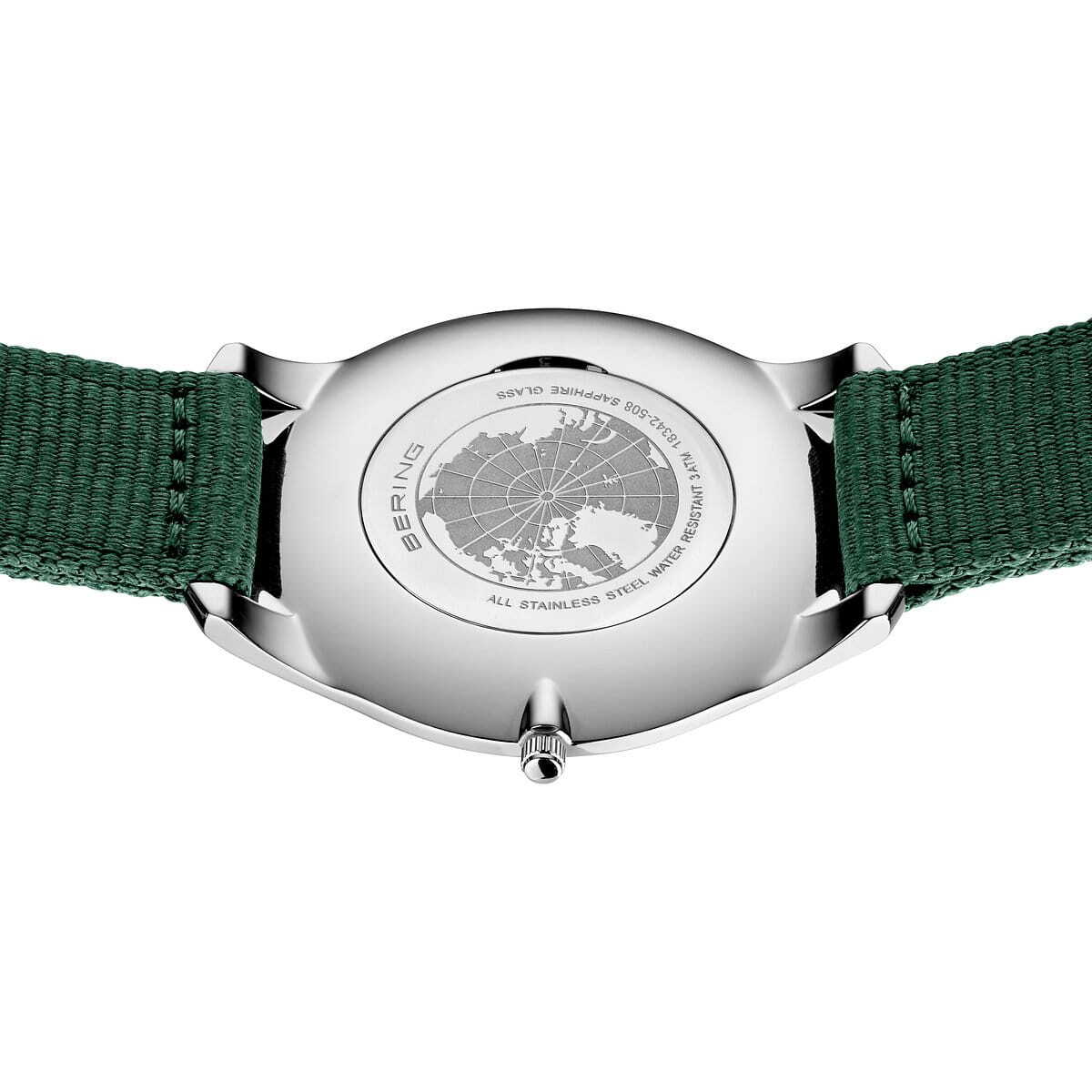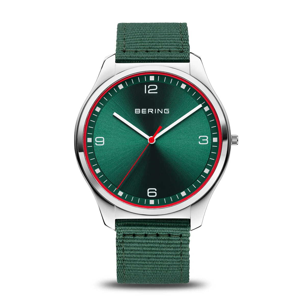 Мужские кварцевые аналоговые наручные часы. Серия Classic Collection Ultra Slim. Центральные часовая, минутная и секундная стрелки. Зелёный циферблат с часовыми метками в виде штрихов и четырёх арабских цифр (12. 3, 6 и 9). Круглый стальной полированный корпус. Диаметр корпуса 42 мм, толщина 5 мм. Устойчивое к возникновению мелких царапин плоское сапфировое стекло. Текстильный ремешок зелёного цвета с классической застёжкой buckle. Ширина ремешка 20 мм, длина ремешка 195 мм. Водонепроницаемость WR30 (защита от брызг).