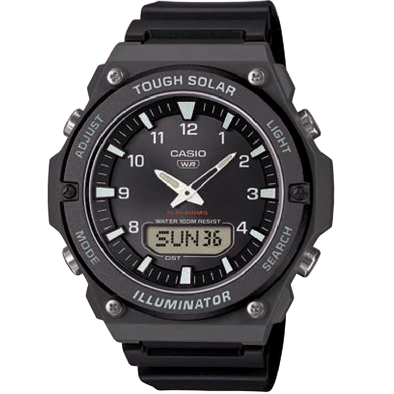 Мужские кварцевые аналого-цифровые наручные часы. Серия Casio Collection Analog-Digital Combination. Питание от солнечной энергии (технология Tough Solar) - источником питания служит светочувствительная панель и аккумулятор, заряжаемый при попадании солнечного света на циферблат часов. Индикатор низкого заряда батареи. Функция автоматического сохранения энергии. Время работы аккумулятора без подзарядки около 10 месяцев, при включенной функции сохранения энергии около 23 месяцев. Центральные часовая и минутная стрелки. Чёрный циферблат с часовыми метками в виде арабских цифр. Стрелки с люминесцентным покрытием, которое светится в темноте после непродолжительного воздействия света. Циферблат подсвечивается светодиодом. Секундомер с точностью показаний 1/100 секунды и временем измерения 1ч. Режимы измерения: отдельные отрезки времени, измерение с разделением, два финишных результата. 2 независимых таймера обратного отсчета от 5с до 100мин с устанавливаемым количеством повторов от 1 до 10. 12-ти и 24-х часовой формат отображения времени. 5 ежедневных будильников, сигнал начала часа. Автоматический календарь до 2099 года, возможность отображения дня недели на шести языках. Функция мирового времени -31 часовая зона (48 городов), всемирное координированное время (UTC), функция включения/отключения летнего времени (DST). Функция выключения звука нажатия кнопок (Mute). Чёрный круглый пластиковый корпус размером 52,5 мм на 50,1 мм, толщиной 12,7 мм. Пластиковое стекло. Чёрный пластиковый ремешок с классической застёжкой buckle. Водонепроницаемость 100WR (часы подходят для плавания с маской, трубкой и обычного плавания). Вес около 46 г.