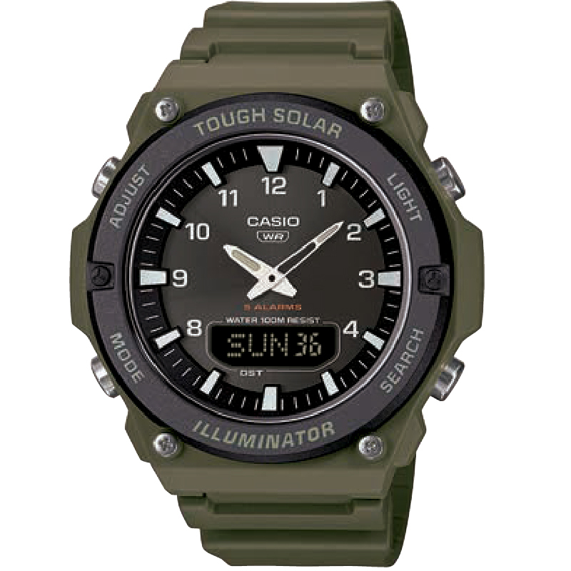 Мужские кварцевые аналого-цифровые наручные часы. Серия Casio Collection Analog-Digital Combination. Питание от солнечной энергии (технология Tough Solar) - источником питания служит светочувствительная панель и аккумулятор, заряжаемый при попадании солнечного света на циферблат часов. Индикатор низкого заряда батареи. Функция автоматического сохранения энергии. Время работы аккумулятора без подзарядки около 10 месяцев, при включенной функции сохранения энергии около 23 месяцев. Центральные часовая и минутная стрелки. Чёрный циферблат с часовыми метками в виде арабских цифр. Стрелки с люминесцентным покрытием, которое светится в темноте после непродолжительного воздействия света. Циферблат подсвечивается светодиодом. Секундомер с точностью показаний 1/100 секунды и временем измерения 1ч. Режимы измерения: отдельные отрезки времени, измерение с разделением, два финишных результата. 2 независимых таймера обратного отсчета от 5с до 100мин с устанавливаемым количеством повторов от 1 до 10. 12-ти и 24-х часовой формат отображения времени. 5 ежедневных будильников, сигнал начала часа. Автоматический календарь до 2099 года, возможность отображения дня недели на шести языках. Функция мирового времени -31 часовая зона (48 городов), всемирное координированное время (UTC), функция включения/отключения летнего времени (DST). Функция выключения звука нажатия кнопок (Mute). Зелёный круглый пластиковый корпус размером 52,5 мм на 50,1 мм, толщиной 12,7 мм. Пластиковое стекло. Зелёный пластиковый ремешок с классической застёжкой buckle. Водонепроницаемость 100WR (часы подходят для плавания с маской, трубкой и обычного плавания). Вес около 46 г.