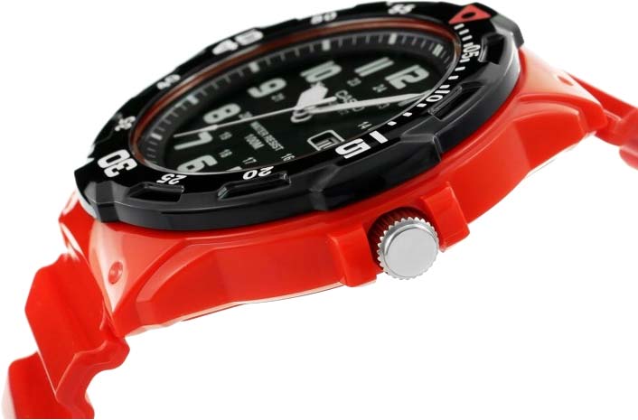 Мужские кварцевые наручные часы с аналоговым отображением времени. Серия Casio Collection. Яркие часы в спортивном стиле для активного отдыха и повседневного использования. Центральные часовая, минутная и секундная стрелки. Чёрный циферблат с часовыми метками в виде арабских цифр. Стрелки с люминесцентным покрытием, которое светится в темноте после непродолжительного воздействия света. 24-х часовая шкала на циферблате. Индикация даты и дня недели в позиции 3 часов (значение даты меняется до 31, для месяцев, у которых количество дней меньше 31, необходимо корректировать значение вручную). Пластиковое стекло. Круглый корпус из полимерного пластика красного цвета. Размеры корпуса 44,6 мм на 47,9мм, толщина 11,6мм. Чёрный вращающийся безель с минутной шкалой. Переводная головка с защитой. Красный пластиковый ремешок с классической застёжкой buckle. Батарейка рассчитана на 3 года. Водонепроницаемость 100WR (часы подходят для плавания с маской, трубкой, обычного плавания). Вес около 39 г.