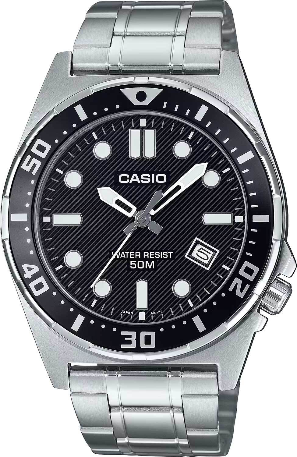 Мужские кварцевые аналоговые наручные часы. Casio Collection. Центральные часовая, минутная и секундная стрелки. Чёрный циферблат с часовыми метками в виде штрихов и точек. Стрелки и метки с люминесцентным покрытием, которое светится в темноте после непродолжительного воздействия света. Окошко даты в положении 4 ч. Устойчивое к мелким механическим повреждениям минеральное стекло. Круглый стальной корпус размером 43,6 мм на 50мм, толщиной 9,3 мм. Чёрный безель с минутной шкалой. Переводная головка с защитой в положении 4 ч. Стальной браслет с тройной раскладывающейся застежкой Водонепроницаемость 50WR (мытьё рук, дождь). Вес около 126 г.