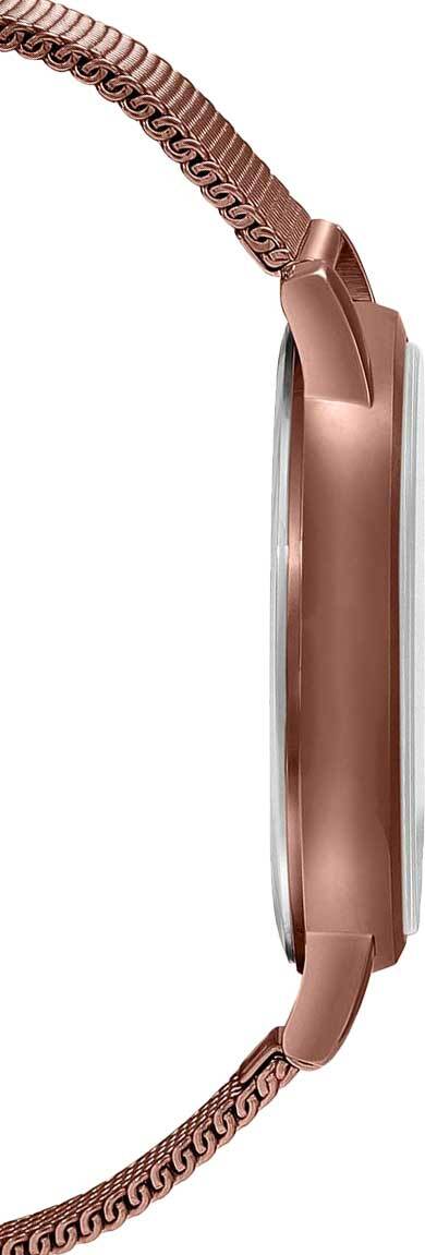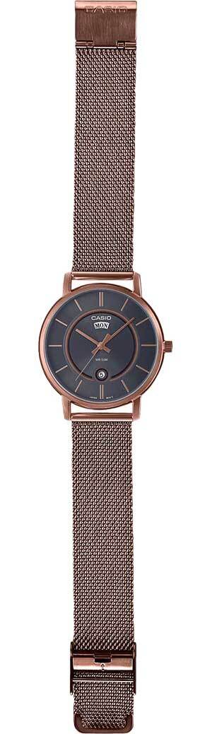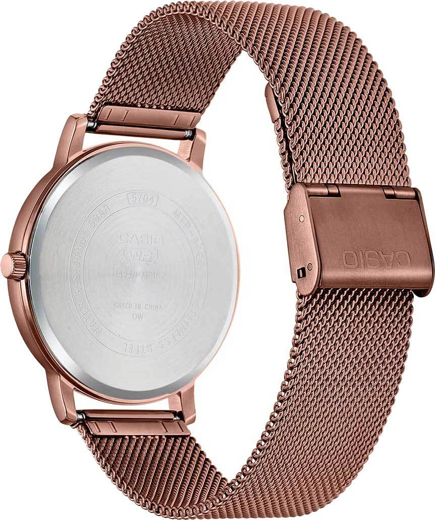 Мужские аналоговые кварцевые часы. Casio Collection. Центральные часовая, минутная и секундная стрелки золотистого цвета. Чёрный циферблат с часовыми метками в виде штрихов. Устойчивое к мелким механическим повреждениям минеральное стекло. Окошко даты в положении 6 ч (значение даты меняется до 31, для месяцев, у которых количество дней меньше 31, необходимо корректировать значение вручную). Окошко дня недели в положении 12 ч. Круглый стальной корпус с покрытием цвета розового золота. Размер корпуса 41 мм на 48 мм, толщина 8,3 мм. Стальной браслет миланского плетения с покрытием цвета розового золота, регулируемая застежка. Батарея рассчитана на 3 года. Водонепроницаемость 50 WR (мытьё рук, дождь). Вес около 75 г.