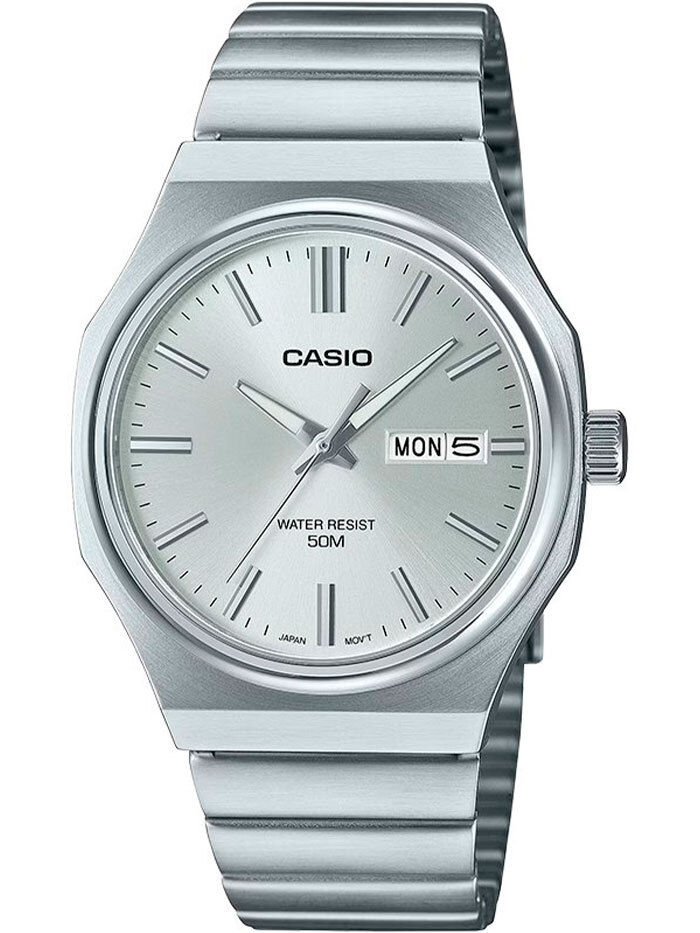 Мужские аналоговые кварцевые часы. Casio Collection. Центральные часовая, минутная и секундная стрелки. Серебристый циферблат с часовыми метками в виде штрихов. Стрелки с люминесцентным покрытием, которое светится в темноте после непродолжительного воздействия света. Окошко даты и дня недели в позиции 3 ч. (значение даты меняется до 31, для месяцев, у которых количество дней меньше 31, необходимо корректировать значение вручную). Устойчивое к мелким механическим повреждениям минеральное стекло. Стальной корпус размером 37,5 мм на 44,5 мм, толщиной 8,4 мм. Стальной браслет с тройной раскладывающейся застежкой. Батарейка рассчитана на 3 года. Водонепроницаемость 50 WR (мытьё рук, дождь). Вес около 110 г.