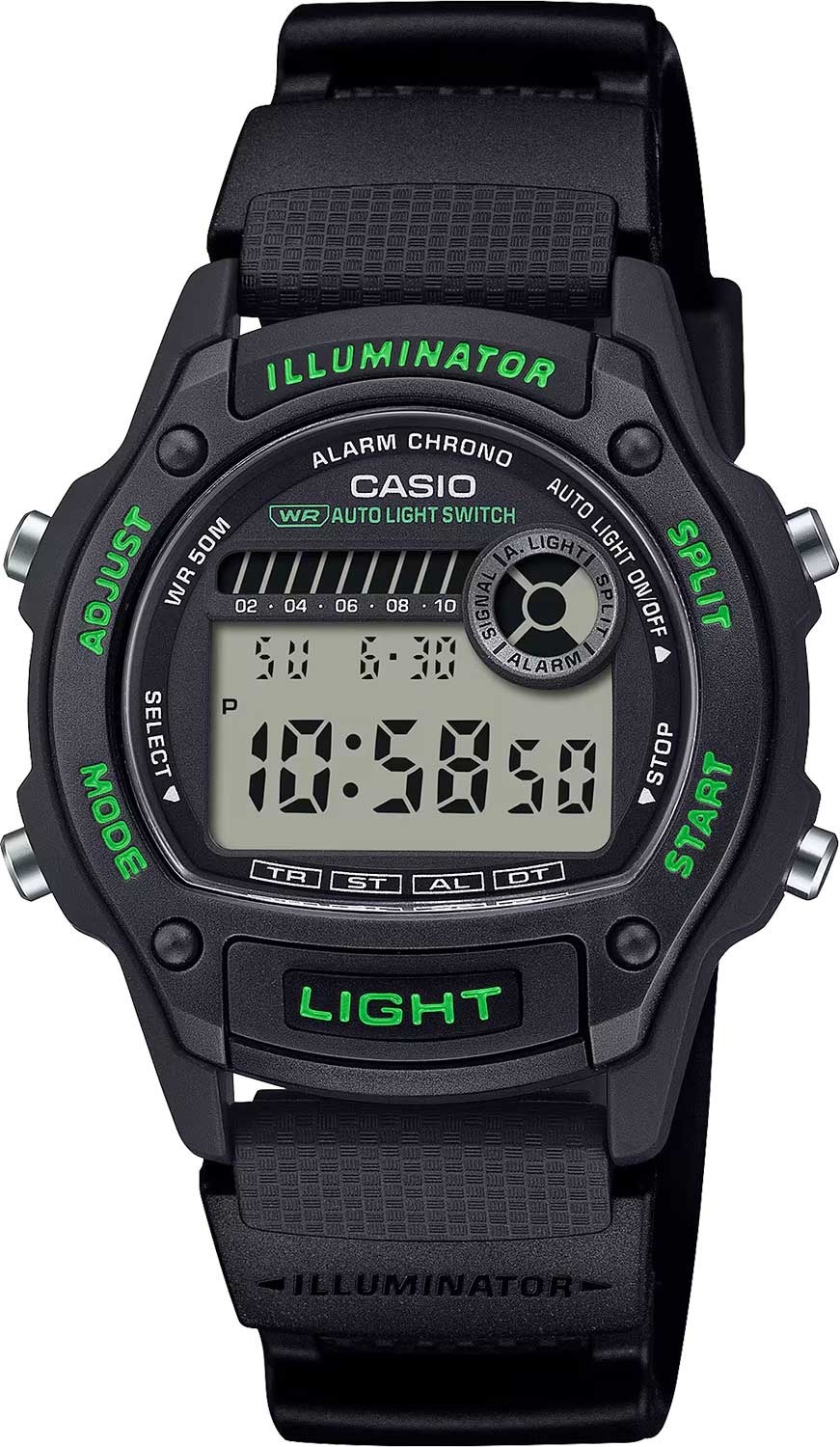 Мужские кварцевые наручные часы с цифровым отображением времени. Серия Casio Collection Standard Digital. Циферблат подсвечивается светодиодом с функцией послесвечения. Цвет подсветки оранжевый. 12-ти и 24-х часовой формат отображения времени. Секундомер с точностью показаний 1/100 с (до 1 ч) и 1 с (после 1 ч) и временем измерения 24часа. Таймер обратного отсчета от 1минуты до 24часов с автоповтором. Ежедневный будильник, ежечасный сигнал. Второй часовой пояс (отображение времени двух часовых поясов одновременно). Автоматический календарь до 2099 года. Круглый корпус из полимерного пластика чёрного цвета. Размеры корпуса 36,6мм на 43 мм, толщина 10,9 мм. Выпуклое пластиковое стекло. Чёрный ремешок из биопластика (изготавливается из возобновляемых органических ресурсов) с классической застежкой buckle. Батарейка рассчитана на 3 года. Водонепроницаемость WR50 (мытьё рук, дождь). Вес около 27 г.