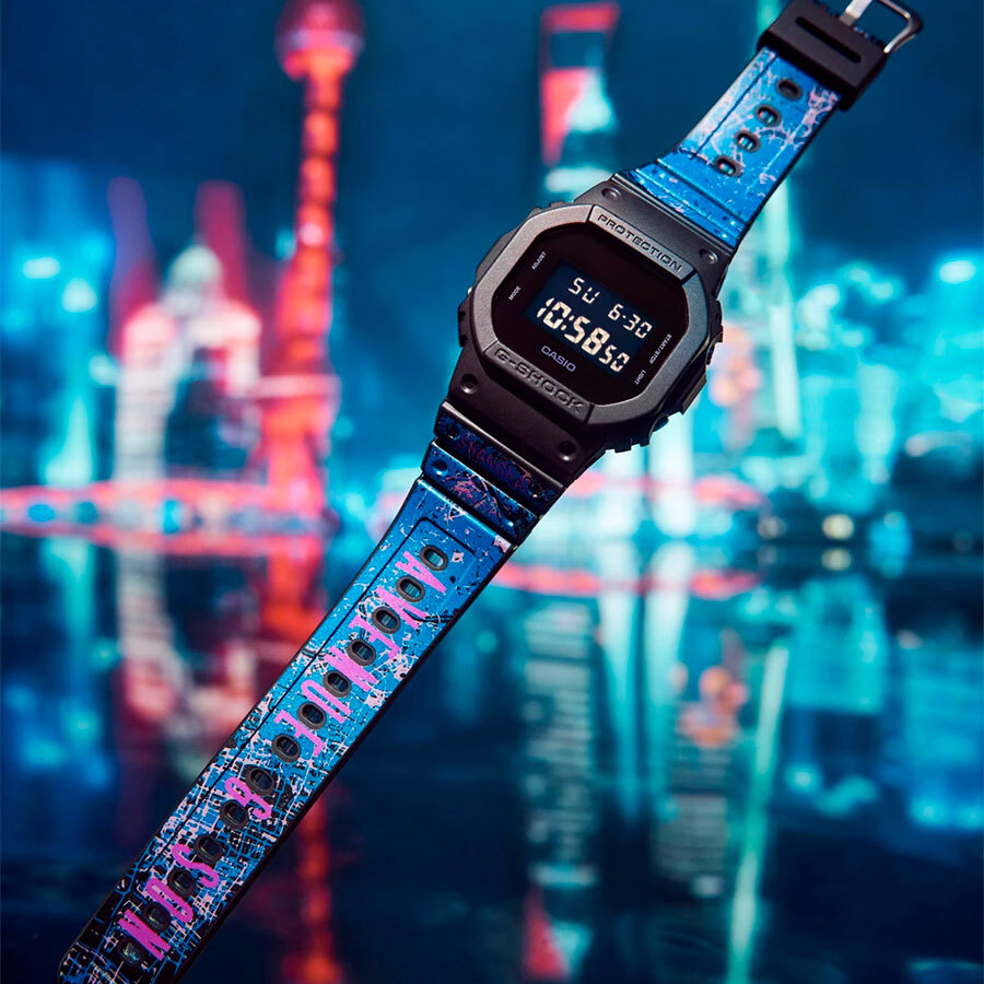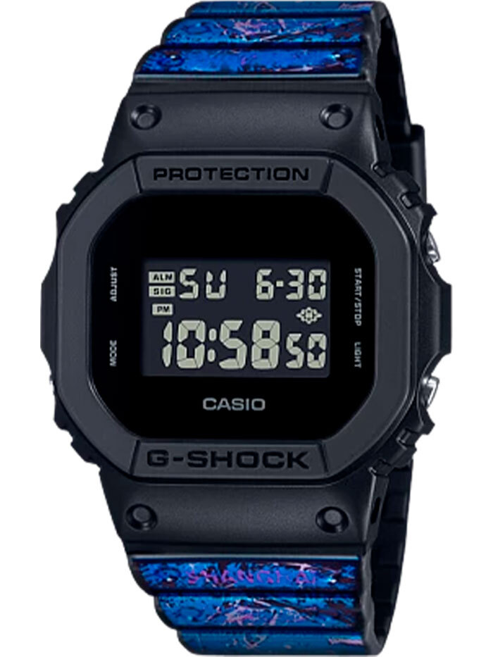 Мужские кварцевые часы с цифровой индикацией времени. Коллекция G-Shock x Avenue & Son. Лимитированная серия (100 экземпляров), созданная совместно с шанхайским скейтерским брендом Avenue & Son, основанном в 2014 году четырьмя профессиональными шанхайскими райдерами. Противоударный корпус защищает механизм часов от ударов и вибрации. Электролюминесцентная подсветка освещает весь дисплей, функция послесвечения. Световая индикация сигнала (LED-индикатор) - лампочка мигает при сигнале будильника, окончании таймера обратного отсчета или секундомера. Секундомер с точностью показаний 1/100 секунды (первый час), 1 секунда (через 1 час) и временем измерения 24 часа. Режимы измерения: прошедшее время, промежуточное время, два финишных результата. Таймер обратного отсчета от 1 секунды до 24 часов с автоповтором. 12-ти и 24-х- часовой формат отображения времени. Многофункциональный будильник, сигнал начала часа. Автоматический календарь до 2099 г. Прямоугольный корпус из полимерного пластика чёрного цвета. Размер корпуса 42,8 мм на 48,9 мм, толщина 13,4 мм. Инверсионный дисплей (тёмный фон со светлой индикацией на нём). Минеральное стекло устойчивое к мелким механическим повреждениям. Синий пластиковый ремешок с классической застежкой buckle. На ремешок нанесен стилизованный принт в виде карты ночного Шанхая, а также логотип бренда. Стальная задняя крышка. Батарейка рассчитана на 2 года. Водонепроницаемость WR200 (плавание и ныряние без акваланга). Вес около 60 г.