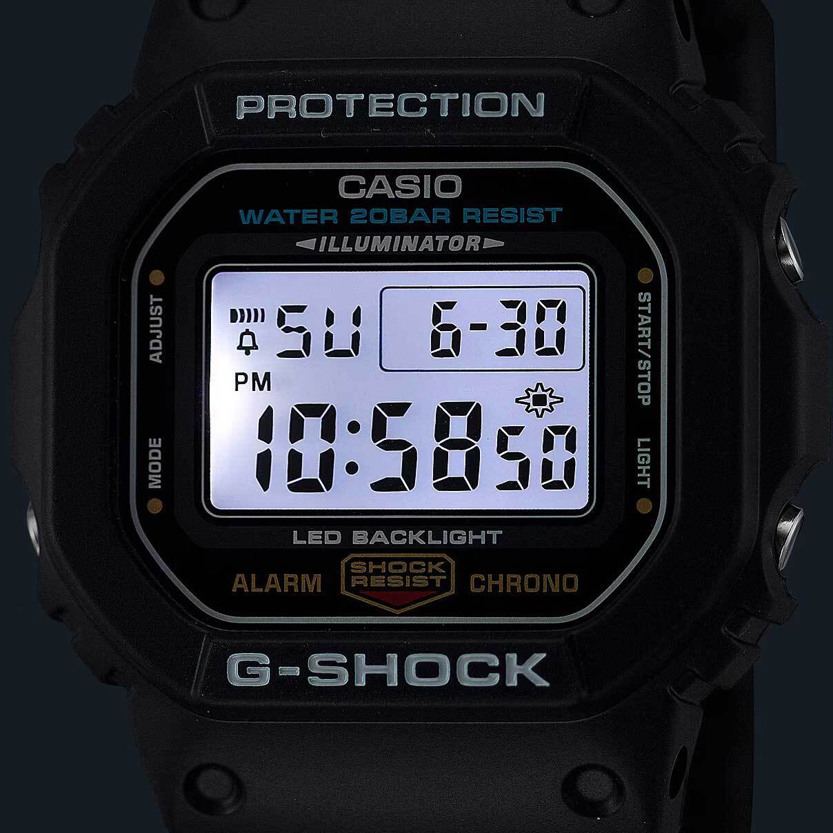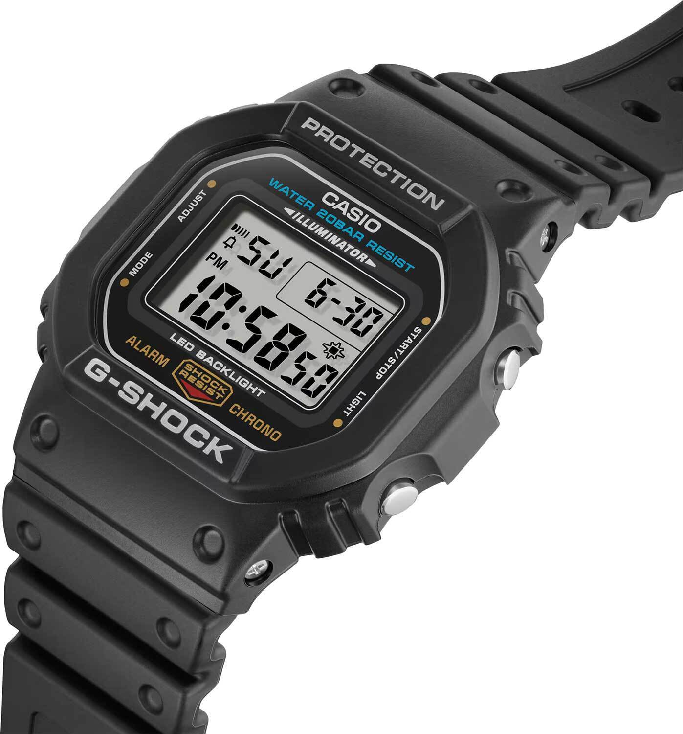 Мужские кварцевые электронные часы. Коллекция G-Shock. Противоударный корпус защищает механизм часов от ударов и вибрации. Светодиодная подсветка с функцией послесвечения. Световой сигнал (LED-индикатор) - светодиодная лампочка мигает при сигнале будильника, окончании таймера обратного отсчета или секундомера. Секундомер с точностью показаний 1/100 секунды (первый час), 1 секунда (через 1 час) и временем измерения 24 часа. Режимы измерения: прошедшее время, промежуточное время, два финишных результата. Таймер обратного отсчета от 1 секунды до 24 часов (с интервалом в 1 секунду, с интервалом в 1 минуту и с интервалом в 1 час) с автоповтором. 12-ти и 24-х часовой формат отображения времени. Многофункциональный будильник, ежедневный звуковой сигнал, индикация начала часа. Автоматический календарь до 2099 г. Прямоугольный корпус из полимерного пластика чёрного цвета. Размер корпуса 42,8 мм x 48,9 мм , толщина 13,4 мм. Чёрный пластиковый ремешок с классической застежкой. Минеральное стекло устойчивое к мелким механическим повреждениям. Батарейка рассчитана на 5 лет. Водостойкость WR 200 (плавание и ныряние без акваланга). Вес примерно 53 г.