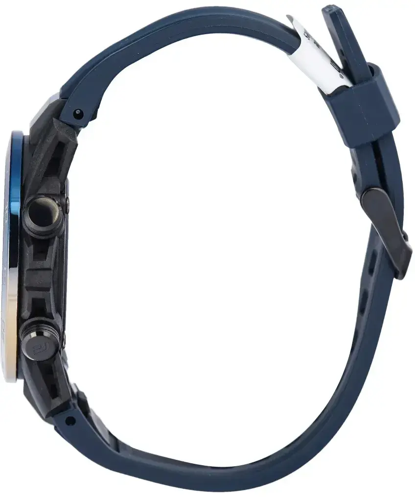 Мужские кварцевые аналогово-цифровые наручные часы на солнечной батарее с технологией Bluetooth®. Серия Casio Edifice Sospension. Дизайн корпуса вдохновлен очертаниями подвески болида Formula Car -ушки часов разработаны по схеме четырехрычажной подвески гоночного автомобиля. Цветовая гамма часов вдохновлена синевой ночного неба, которое пронзает свет уличных фонарей. Питание от солнечной энергии Tought Solar- источником питания служит светочувствительная панель и аккумулятор, который заряжается от солнечного света. Индикаторы уровня заряда аккумулятора (H/M/L). Функция оповещения о низком уровне заряда аккумулятора - при низком уровне секундная стрелка движется с интервалом в 2 секунды. Время работы при полном заряде до 7 месяцев, в режиме энергосбережения до 18 месяцев. Имеется режим энергосбережения — в темноте дисплей гаснет для экономии энергии. Часы оснащены беспроводной технологией Bluetooth® со сверхнизким потреблением энергии для синхронизации со смартфоном. При подключении к смартфону часы корректируют текущее время и также получают доступ к ряду полезных функций. Двойная автоматическая светодиодная подсветка с функцией послесвечения. Одновременно подсвечивается аналоговый циферблат и цифровой дисплей. Настраиваемая длительность подсветки 1.5 или 3 секунды. Светонакопительное покрытие стрелок и меток обеспечивает длительное послесвечение в темноте после кратковременного воздействия света. Секундомер с точностью показаний 1/100 секунды (в течение первого часа), 1 секунда (через 1 час) и временем измерения 24 часа. Режимы измерения: прошедшее время, время прохождения круга дистанции, промежуточное время. Память на 200 кругов (Lap memo). Таймер обратного отсчета от 1 секунды до 60 минут с интервалом в 1 секунду. Мировое время: 38 часовых поясов ( 38 городов), всемирное координированное время (UTC). Функция включения/отключения летнего времени (DST). Переключение между домашним и мировым временем. 5 ежедневных будильников, ежечасный сигнал. Автоматический календарь до 2099 года, возможность отображения дня недели на 6 языках. 12-ти и 24-х часовой формат отображени времени. Включение/выключение звука кнопок (Mute). Функция поиска телефона. Функция перемещения стрелок. Функция Flight Log Memory - можно записать данные о точном местоположении с указанием времени и даты (TIME & PLACE). Чёрный стальной корпус усиленный углеродными волокнами. Безель с IP- покрытием эолотисто-синего цвета. Размеры корпуса 47,8x51мм, толщина 10,8мм. Устойчивое к мелким механическим повреждениям минеральное стекло. Синий пластиковый ремешок с классической застёжкой buckle. Водостойкость WR 100 (плавание без погружения). Вес около 63 г.