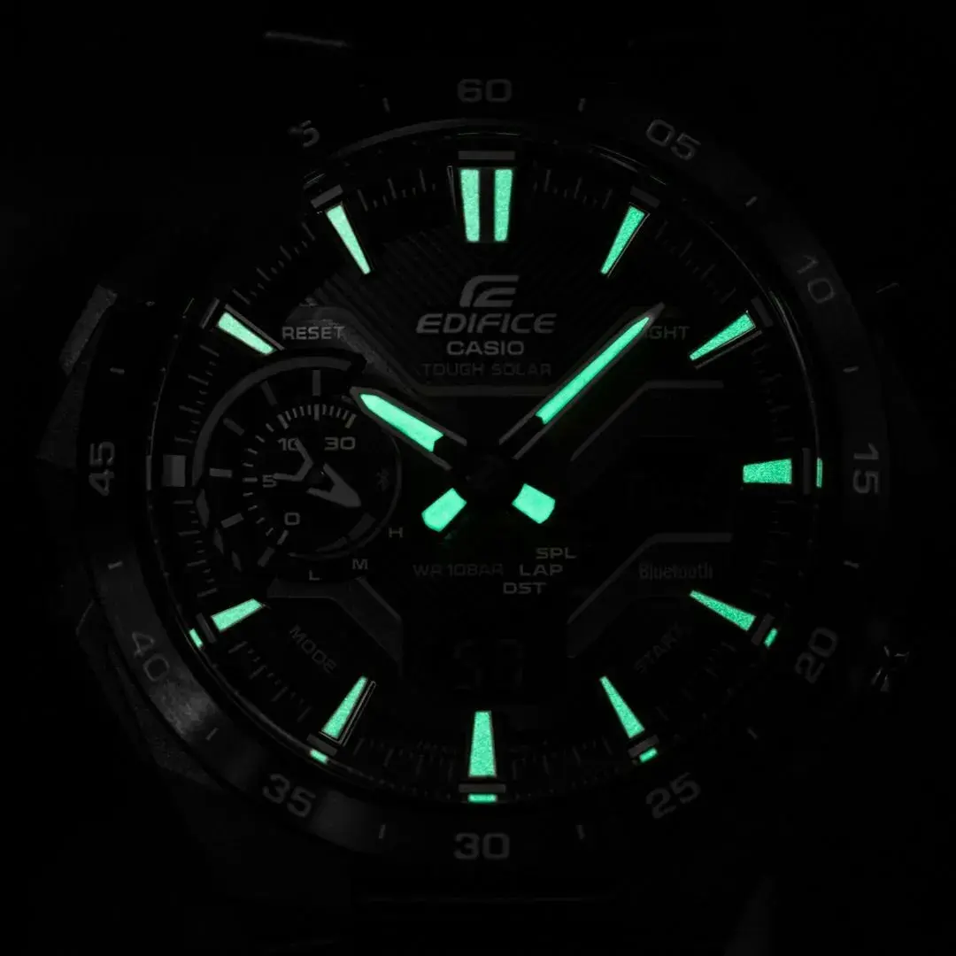 Мужские кварцевые аналого-цифровые часы. Серия Edifice Windflow. Дизайн часов вдохновлен воздушным потоком вокруг гоночного автомобиля. Корпус часов выполнен из композитного материала на основе углеродного волокна, безель изготовлен из того же материала, а черный ободок из нержавеющей стали с ионным напылением. Питание от солнечной энергии Tought Solar- источником питания служит светочувствительная панель и аккумулятор, заряжаемый при попадании солнечного света на циферблат часов. Индикатор уровня заряда батареи. Функция энергосбережения (в темноте дисплей гаснет для экономии энергии). Время работы аккумулятора без подзарядки около 7 месяцев, при включенной функции сохранения энергии около 18 месяцев. Синхронизация со смартфоном с помощью беспроводной энергосберегающей технологии Bluetooth®. При подключении к смартфону часы корректируют текущее время, настраивают будильник, а также копируют настройки мирового времени (до 300 городов). Двойная светодиодная подсветка обеспечивает подсветку не только аналогового циферблата, но и цифрового дисплея. Настраиваемое послесвечение 1.5 или 3 секунды. Необритовое светонакопительное покрытие стрелок обеспечивает длительное послесвечение в темноте даже после кратковременного воздействия света. Мировое время – 38 городов (38 часовых поясов), всемирное координированное время (UTC). Автоматический переход на зимнее и летнее время, возможность включения/отключения данной функции. Переключение между домашним и мировым временем. Отображение кода и названия города. Секундомер с точностью показаний 1/100 с (в течение первого часа), 1 секунда (через 1 час) и временем измерения 24 ч. Режимы измерения: прошедшее время, время прохождения части и круга дистанции. Память на 200 кругов. Таймер обратного отсчета от 1 секунды до 60 минут. 30-минутный стрелочный индикатор обратного отсчета (малый отдельный циферблат в положении 9 ч) показывает время до следующего сигнала будильника и время, оставшееся до окончания работы таймера. 5 ежедневных будильников, ежечасный сигнал. Автоматический календарь до 2099 года. Отображение дней недели на шести языках. Функция перемещения стрелок для удобного просмотра информации на цифровом экране. Функция поиска телефона. Функция включения/отключения звука кнопок. 12-ти и 24-х часовой формат отображения времени. Функция Flight Log Memory - можно записать данные о точном местоположении с указанием времени и даты (TIME & PLACE). Круглый из композитного материала на основе углеродного волокна с чёрным IP покрытием. Размер корпуса 48,2 мм на 47,6 мм, толщина 11,9 мм. Безель из углеродного волокна, минутная шкала на безеле. Стальной браслет с IP покрытием чёрного цвета, тройная раскладывающаяся застёжка. Устойчивое к мелким механическим повреждениям минеральное стекло. Водонепроницаемость 100WR (часы подходят для плавания с маской и трубкой. Обычного плавания). Вес около 121 г.