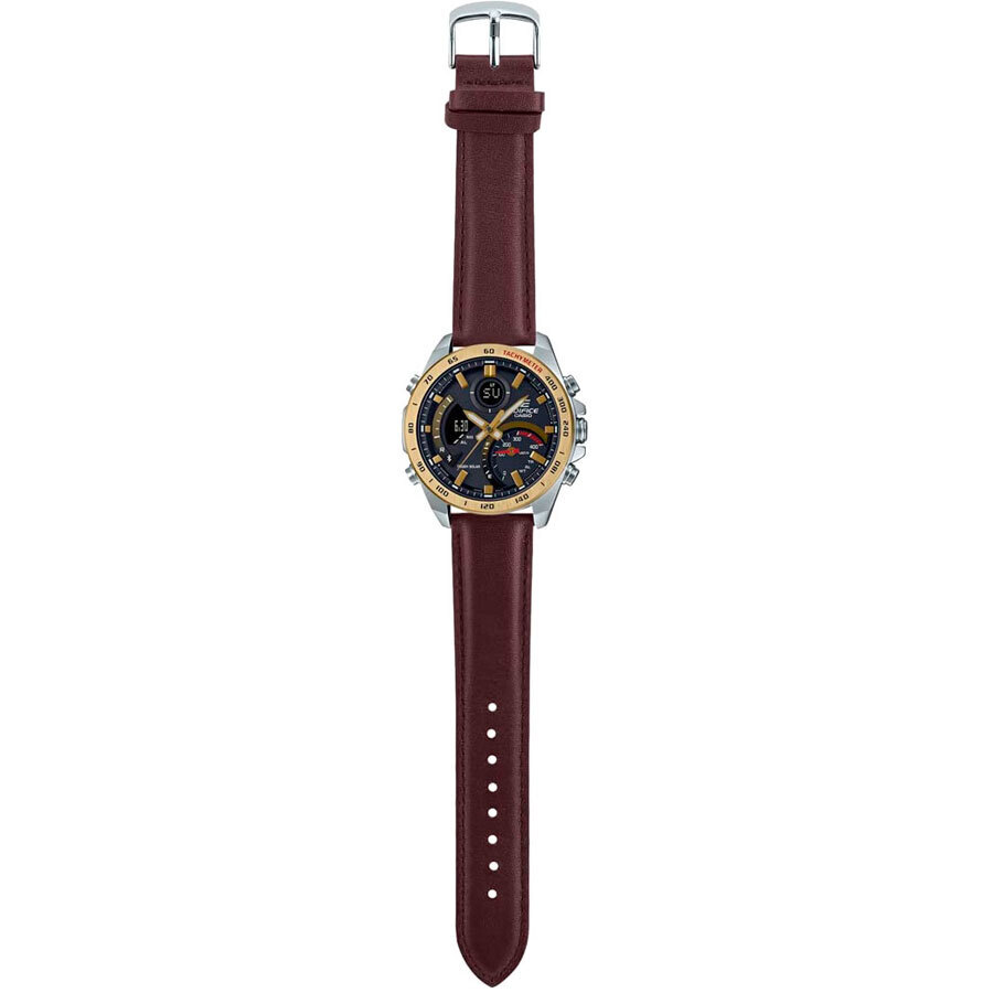 Мужские кварцевые аналого-цифровые наручные часы на солнечной батарее. Серия Casio Edifice. Питание от солнечной энергии (технология Tough Solar) - источником питания служит светочувствительная панель и аккумулятор, подзаряжаемый при попадании солнечного света на циферблат часов. Время работы при полном заряде до 6 месяцев, в режиме энергосбережения до 18 месяцев. Индикатор уровня заряда батареи. Функция автоматического энергосбережения (дисплей гаснет, а стрелки останавливаются для экономии энергии, когда часы оказываются в темноте). Часы оснащены беспроводной технологией Bluetooth® со сверхнизким потреблением энергии для синхронизации со смартфоном. При подключении к смартфону часы автоматически корректируют текущее время и получают доступ к ряду полезных функций. Двойная автоматическая светодиодная подсветка с функцией послесвечения (одновременно подсвечивается аналоговый циферблат и цифровой дисплей). Настраиваемая длительность подсветки 1.5 или 3 секунды. Светонакопительное покрытие (Neobrite) стрелок обеспечивает длительное послесвечение в темноте даже после кратковременного воздействия света. Секундомер с точностью показаний 1/1000 секунды (в течение первого часа), 1/10 секунды (через 1 час) и временем измерения 24 часа. Режимы измерения: прошедшее время, общее время измерения, время прохождения части дистанции, записная книжка секундомера (до 200 записей). Таймер обратного отсчета от 1 секунды и до 24 ч. Мировое время - 39 часовых зон ( 39 городов), всемирное координированное время (UTC). Функция включения/отключения летнего времени. 5 ежедневных будильников. Автоматический календарь до 2099 года, отображение дней недели на 6 языках. Включение/выключение звука кнопок. Функция поиска телефона. Функция перемещения стрелок. Отображение скорости. 12/24-часовой формат отображения времени. Круглый стальной корпус с покрытием золотистого цвета на безеле. Размеры корпуса 48 мм х 51,5 мм , толщина 13,9 мм. Чёрный циферблат с часовыми метками в виде штрихов. Центральные часовая, минутная и секундная стрелки. Тахиметрическая шкала на безеле для расчёта скорости. Устойчивое к мелким механическим повреждениям минеральное стекло. Переводная головка с защитой. Коричневый кожаный ремешок с классической застёжкой buckle. Водостойкость WR 100 (плавание и погружение без акваланга). Вес около 96г.
