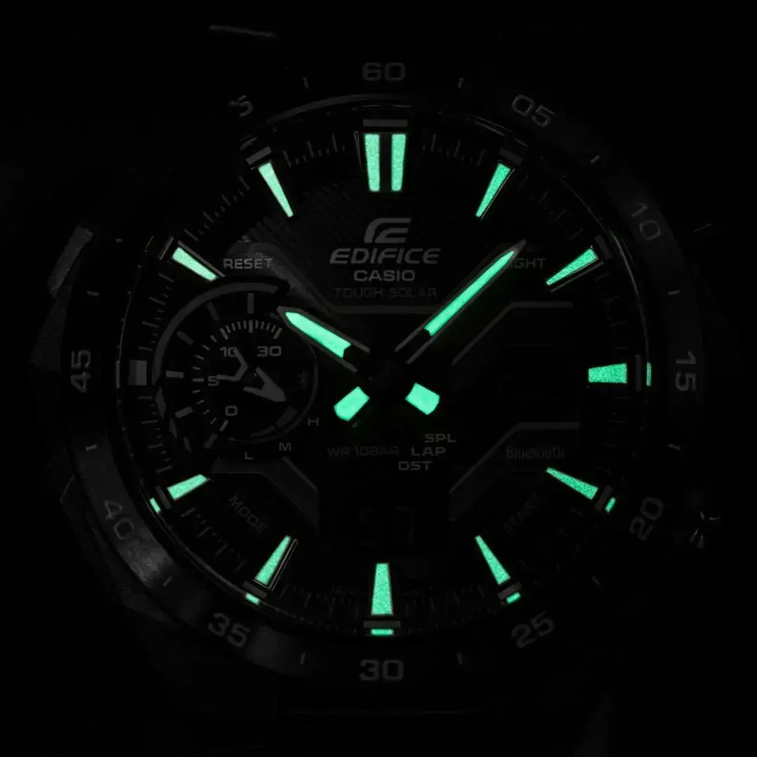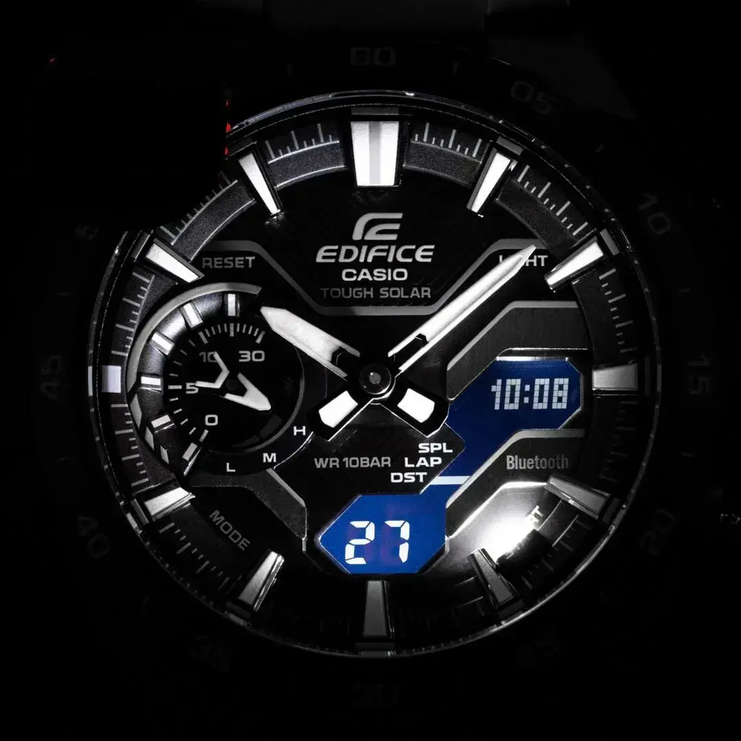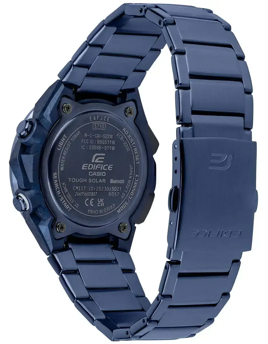 Мужские кварцевые аналогово-цифровые часы. Серия Edifice Windflow. Дизайн часов вдохновлен воздушным потоком вокруг гоночного автомобиля. Питание от солнечной энергии Tought Solar- источником питания служит светочувствительная панель и аккумулятор, заряжаемый при попадании солнечного света на циферблат часов. Индикатор уровня заряда батареи. Функция энергосбережения (в темноте дисплей гаснет для экономии энергии). Примерный срок работы аккумулятора без подзарядки в обычном режиме до 7 месяцев, при включенной функции сохранения энергии до 18 месяцев. Синхронизация со смартфоном с помощью беспроводной энергосберегающей технологии Bluetooth®. При подключении к смартфону часы корректируют текущее время, настраивают будильник, а также копируют настройки мирового времени (до 300 городов). Двойная светодиодная подсветка (светодиод подсвечивет циферблат и ЖК-дисплей) с функцией послесвечения. Настраиваемая длительность подсветки 1.5 или 3 секунды. Необритовое светонакопительное покрытие стрелок обеспечивает длительное послесвечение в темноте даже после кратковременного воздействия света. Мировое время – 38 городов (38 часовых поясов), всемирное координированное время (UTC). Автоматический переход на зимнее и летнее время, возможность включения/отключения данной функции. Переключение между домашним и мировым временем. Секундомер с точностью показаний 1/100 с (в течение первого часа), 1 секунда (через 1 час) и временем измерения до 24 часов. Режимы измерения: прошедшее время, время прохождения части и круга дистанции. Память на 200 кругов. Таймер обратного отсчета от 1 секунды до 60 минут. 30-минутный стрелочный индикатор обратного отсчета (малый отделный циферблат в положении 9 ч) показывает время до следующего сигнала будильника и время, оставшеея до окончания работы таймера. 5 ежедневных будильников, ежечасный сигнал. Автоматический календарь до 2099 года. Отображение дней недели на шести языках. Функция перемещения стрелок для удобного просмотра информации на цифровом экране. Функция поиска телефона. Функция включения/отключения звука кнопок. 12-ти и 24-х часовой формат отображения времени. Функция Flight Log Memory - можно записать данные о точном местоположении с указанием времени и даты (TIME & PLACE). .Круглый корпус из полимерного пластика, усиленного углеродними волокнами индигово-синего цвета. Размеры корпуса 48,2 мм на 47,6 мм, толщина 11,9 мм. Стальной безель с покрытием синего цаета, минутная шкала на безеле. Стальной браслет с покрытием чинего цвета, тройная раскладывающаяся застёжка. Устойчивое к мелким механическим поврежениям минеральное стекло. Водостойкость WR 100 (плавание с маской и трубкой). Вес около 126 г.