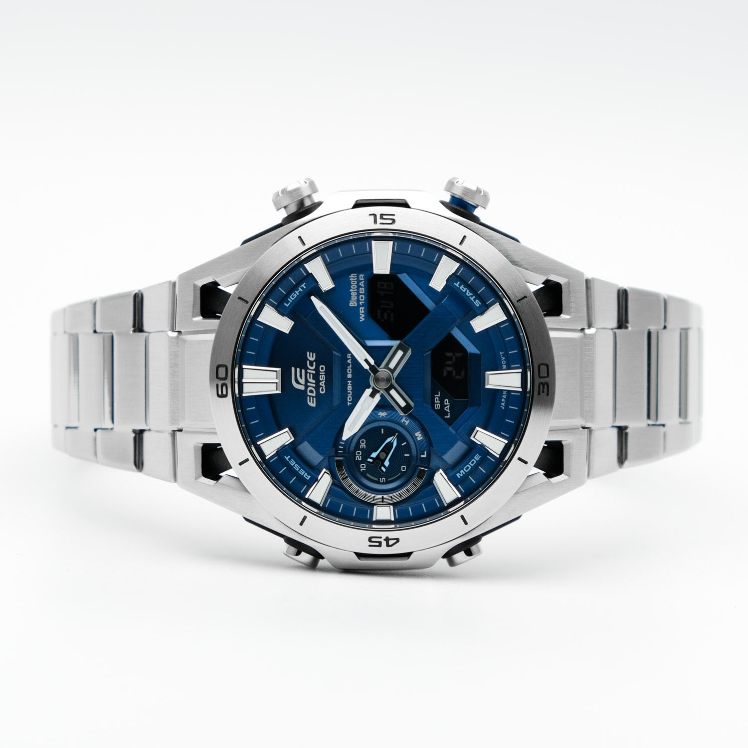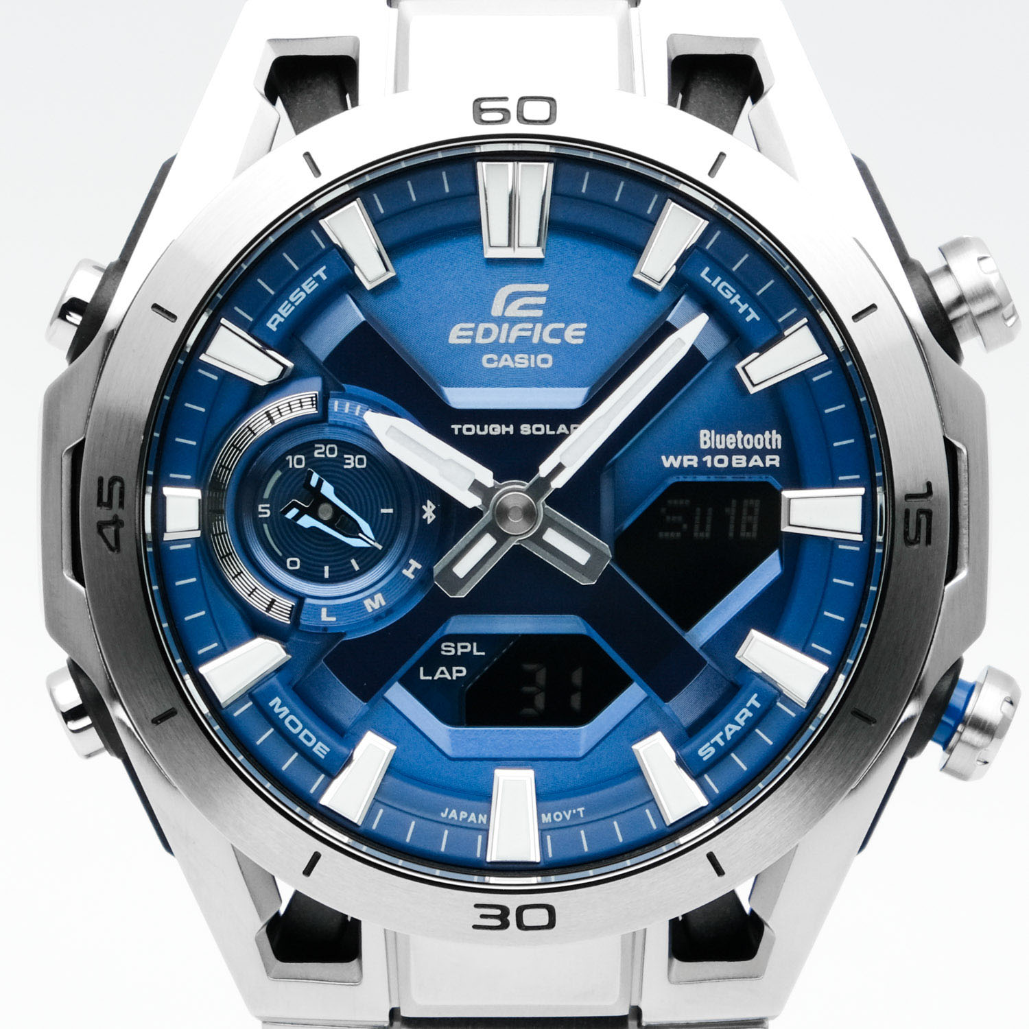 Мужские кварцевые аналого-цифровые наручные часы на солнечной батарее. Серия Edifice Sospensione -сочетание функциональности и элегантности, вдохновленное автоспортом. Особенностью модели является прочный и легкий стальной корпус усиленный углеродными волокнами. Это одни из немногих часов линейки Edifice в карбоновом корпусе. Дизайн часов вдохновлён внешним видом болидов Формулы-1: конструкция корпуса выполнена в стилистике подвесок гоночных автомобилей, в которых колеса болида крепятся к шасси на карбоновых лучах. Питание от солнечной энергии (технология Tough Solar) - источником питания служит светочувствительная панель и аккумулятор, заряжаемый при попадании солнечного света на циферблат часов. Время работы при полном заряде до 7 месяцев, в режиме энергосбережения до 18 месяцев. Индикатор уровня заряда батареи. Функция автоматического энергосбережения (в темноте дисплей гаснет, а стрелки останавливаются). Часы оснащены беспроводной технологией Bluetooth® со сверхнизким потреблением энергии для синхронизации со смартфоном. При подключении к смартфону часы автоматически корректируют текущее время и получают доступ к ряду полезных функций. Двойная автоматическая светодиодная подсветка с функцией послесвечения (одновременно подсвечивается аналоговый циферблат и цифровой дисплей). Настраиваемая длительность подсветки 1.5 или 3 секунды. При недостаточном освещении поворот руки обеспечит автоматическое включение подсветки. Светонакопительное покрытие (Neobrite) стрелок обеспечивает длительное послесвечение в темноте после кратковременного воздействия света. Секундомер с точностью показаний 1/100 секунды и временем измерения 24 часа. Таймер обратного отсчета от 1 секунды и до 1 часа с автоповтором. Мировое время - 38 часовых зон (38 городов), всемирное координированное время (UTC), включение/отключение летнего времени. 5 ежедневных будильников, ежечасный сигнал. Автоматический календарь до 2099 года, отображение дней недели на 6 языках. Включение/выключение звука кнопок. Функция поиска телефона. Функция перемещения стрелок для удобного просмотра информации на цифровых дисплеях.12/24-часовой формат отображения времени. Круглый стальной корпус с углеродными волокнами более прочный и лёгкий. Минутная шкала на безеле. Размеры корпуса 45,8 мм на 50,2 мм, толщина 10,9 мм. Синий циферблат с часовыми метками в виде штрихов. Устойчивое к мелким механическим повреждениям минеральное стекло. Стальной браслет с раскладывающейся застежкой. Водонепроницаемость 100WR (часы подходят для плавания с маской, трубкой, обычного плавания). Вес около 122г.