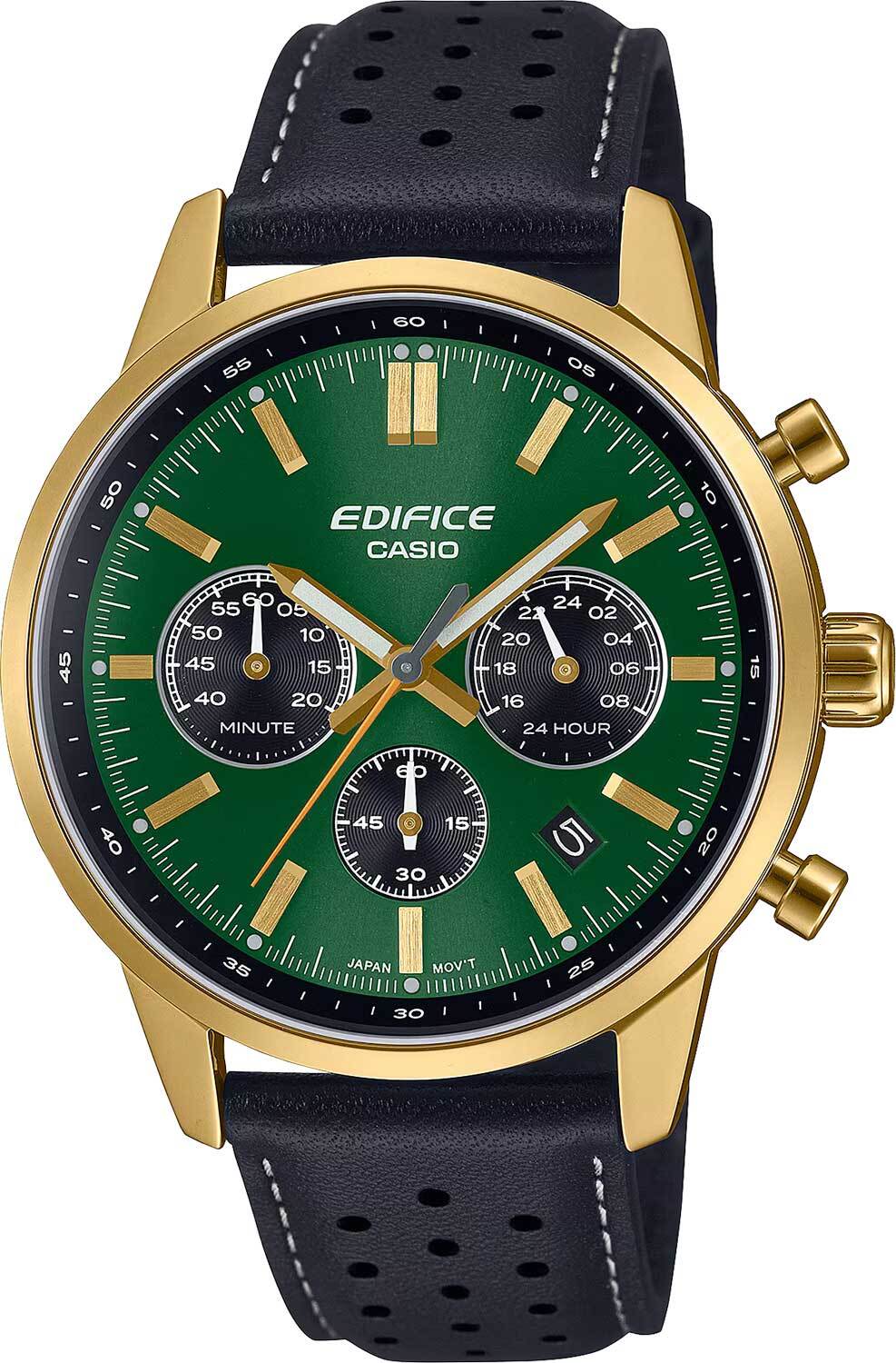 Мужские кварцевые аналоговые часы-хронограф с секундомером. Коллекция Edifice. Центральные часовая, минутная и секундная стрелки. Зелёный циферблат с часовыми метками в виде штрихов. Стрелки и метки с люминесцентным покрытием, которое светится в темноте после непродолжительного воздействия света. Окошко даты в позиции между 4 и 5 ч. Секундомер с точностью показаний 1с и временем измерения 1ч. Режимы измерения: прошедшее время, промежуточное время, два финишных результата. 12-ти и 24-х часовой формат отображения времени (дополнительный малый циферблат в позиции 3 ч.). Устойчивое к мелким механическим повреждениям выпуклое минеральное стекло. Круглый корпус из нержавеющей стали с покрытием цвета жёлтого золота. Размер корпуса 47,9 мм на 40,5 мм, толщина 12,6 мм. Завинчивающаяся задняя крышка. Чёрный кожаный ремешок с перфорацией и белой строчкой, классическая застёжка buckle. Батарейка рассчитана на 2 года. Водонепроницаемость WR100 (плавание и погружение без акваланга). Вес примерно 65 г.