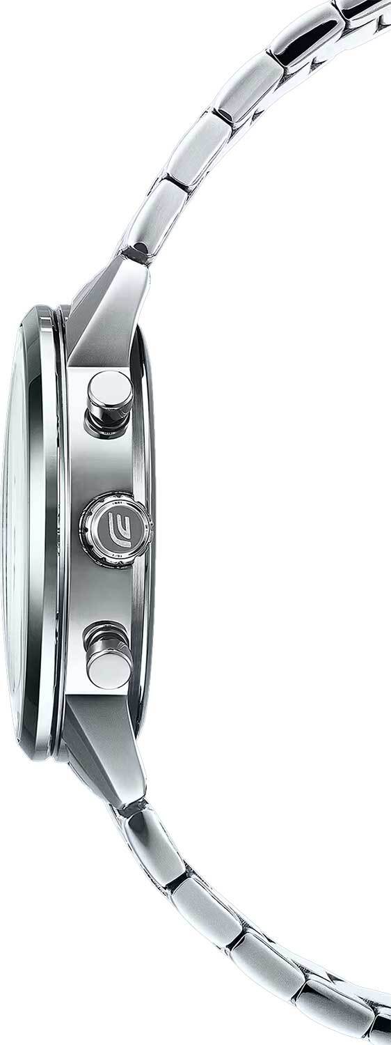 Мужские кварцевые аналоговые часы-хронограф с секундомером. Коллекция Edifice. Центральные часовая, минутная и секундная стрелки. Чёрный циферблат с часовыми метками в виде штрихов. Стрелки и метки с люминесцентным покрытием, которое светится в темноте после непродолжительного воздействия света. Окошко даты в позиции между 4 и 5 ч. Секундомер с точностью показаний 1с и временем измерения 1ч. Режимы измерения: прошедшее время, промежуточное время, два финишных результата. 12-ти и 24-х часовой формат отображения времени (дополнительный малый циферблат в позиции 3 ч.). Устойчивое к мелким механическим повреждениям выпуклое минеральное стекло. Круглый корпус из нержавеющей стали. Размер корпуса 47,9 мм на 40,5 мм, толщина 12,6 мм. Завинчивающаяся задняя крышка. Стальной браслет с тройной раскладывающейся застежкой. Батарейка рассчитана на 2 года. Водонепроницаемость WR100 (плавание и погружение без акваланга). Вес примерно 65 г.