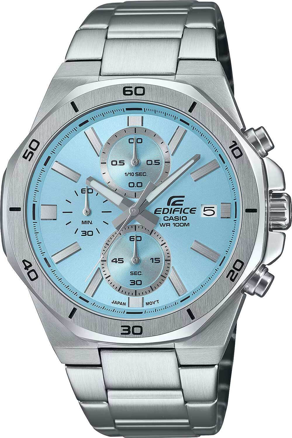 Мужские кварцевые аналоговые часы-хронограф с секундомером. Коллекция Edifice. Центральные часовая, минутная и секундная стрелки. Голубой циферблат с часовыми метками в виде штрихов. Стрелки и метки с люминесцентным покрытием, которое светится в темноте после непродолжительного воздействия света. Окошко даты в положении 3 ч. Секундомер с точностью показаний 1/10 с и временем измерения 60 мин. Режимы измерения: прошедшее время, промежуточное время, два финишных результата. Устойчивое к мелким механическим повреждениям минеральное стекло. Круглый корпус из нержавеющей стали. Размер корпуса 44,3 мм на 47мм, толщина 10,8мм. Переводная головка с защитой. Завинчивающаяся задняя крышка. Стальной браслет, раскладывающаяся застежка с предохранительной защелкой. Батарейка рассчитана на 2 года. Водонепроницаемость WR100 (плавание и погружение без акваланга). Вес примерно 136 г.