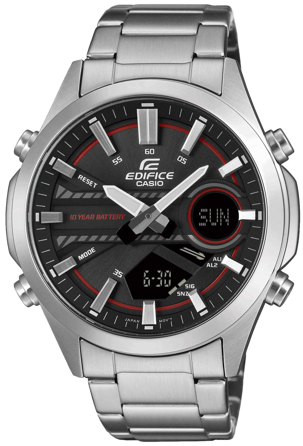 Мужские кварцевые наручные часы с аналого-цифровым отображением времени. Серия Edifice. Центральные часовая и минутная стрелки. Чёрный циферблат с яркими красными деталями и контрастными стрелками и с часовыми метками в виде штрихов. Светонакопительное покрытие стрелок и часовых меток обеспечивает длительное послесвечение в темноте после кратковременного воздействия света. 12-ти и 24-х часовой формат отображения времени. Минутная шкала на циферблате. Секундомер с точностью показаний 1/100 секунды и временем измерения 24 часа. Режимы измерения: прошедшее время, промежуточный результат, два финишных результата. Таймер обратного отсчета от 1минуты до 24часов (с интервалом в 1 минуту), 10-секундный сигнал окончания работы таймера. Мировое время – 30 городов (29 часовых поясов), возможность включения/отключения летнего времени. Записная книжка на 30 ячеек памяти для записи имен и телефонных номеров, каждая запись может включать в себя текст из 8 букв и 16 цифр. 3 независимых будильника, 1 с функцией повтора сигнала Snooze, продолжительность звучания сигнала 10 секунд, сигнал начала часа. Автоматический календарь до 2099 года. Круглый стальной корпус размером 49,5 мм на 45,5 мм, толщиной 13,7 мм. Устойчивое к мелким механическим повреждениям минеральное стекло. Стальной браслет с с тройной раскладывающейся застежкой с фиксатором. Батарея рассчитана на 10 лет. Водонепроницаемость WR 100 (часы подходят для плавание с маской, трубкой, обычного плавания). Вес около 141 г.