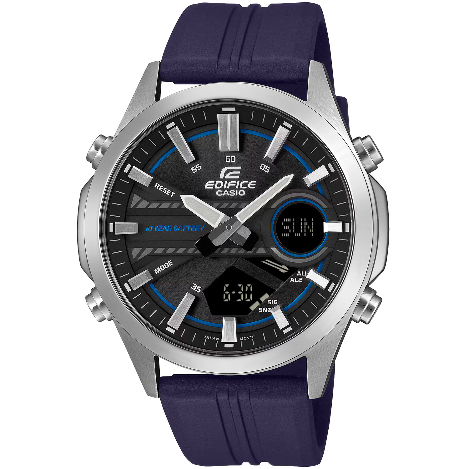 Мужские кварцевые наручные часы с аналого-цифровым отображением времени. Серия Edifice. Центральные часовая и минутная стрелки. Чёрный циферблат с яркими синими деталями и контрастными стрелками и с часовыми метками в виде штрихов. Светонакопительное покрытие стрелок и часовых меток обеспечивает длительное послесвечение в темноте после кратковременного воздействия света. 12-ти и 24-х часовой формат отображения времени. Минутная шкала на циферблате. Секундомер с точностью показаний 1/100 секунды и временем измерения 24 часа. Режимы измерения: прошедшее время, промежуточный результат, два финишных результата. Таймер обратного отсчета от 1минуты до 24часов (с интервалом в 1 минуту), 10-секундный сигнал окончания работы таймера. Мировое время – 30 городов (29 часовых поясов), возможность включения/отключения летнего времени. Записная книжка на 30 ячеек памяти для записи имен и телефонных номеров, каждая запись может включать в себя текст из 8 букв и 16 цифр. 3 независимых будильника, 1 с функцией повтора сигнала Snooze, продолжительность звучания сигнала 10 секунд, сигнал начала часа. Автоматический календарь до 2099 года. Круглый стальной корпус размером 49,5 мм на 45,5 мм, толщиной 13,7 мм. Устойчивое к мелким механическим повреждениям минеральное стекло. Синий ремешок из полимерного пластика с классической застёжкой buckle. Батарея рассчитана на 10 лет. Водонепроницаемость WR 100 (часы подходят для плавание с маской, трубкой, обычного плавания). Вес около 84 г.