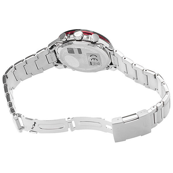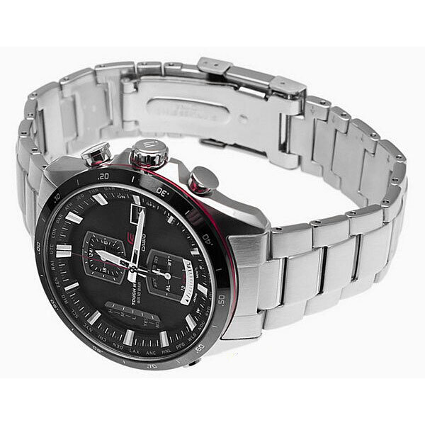 Мужские кварцевые аналоговые наручные часы. Серия Edifice. Питание от солнечной энергии (технология Tough Solar) - источником питания служит светочувствительная панель и аккумулятор, подзаряжаемый при попадании солнечного света на циферблат часов. Индикатор уровня заряда аккумулятора. Функция сохранения энергии. Время работы аккумулятора без подзарядки около 5 месяцев, при включенной функции сохранения энергии до 29 месяцев. Коррекция текущего времени радиосигналом на территории почти всей Европы, США, Японии и Китая. Центральные часовая, минутная и секундная стрелки. Чёрный циферблат с часовыми индексами в виде штрихов. Стрелки и метки с люминесцентным покрытием, которое светится в темноте после непродолжительного воздействия света. Окошко даты в позиции 3 ч. Секундомер с точностью показаний 1/20с и временем измерения 1ч. Режимы измерения: прошедшее время; сохранение в памяти до 10 результатов, лучшее время прохождения дистанции. 12-ти и 24-х часовой формат отображения времени (стрелочный указатель на дополнительном малом циферблате в позиции 12 ч). Мировое время. Ежедневный будильник. Устойчивое к мелким механическим повреждениям минеральное стекло. Корпус из нержавеющей стали. Размеры корпуса 43,1 мм на 47мм, толщина 12,1 мм. Завинчивающаяся переводная головка с защитой. Стальной браслет с раскладывающейся застежкой. Водонепроницаемость WR100 (плавание и погружение без акваланга). Вес около 140г.