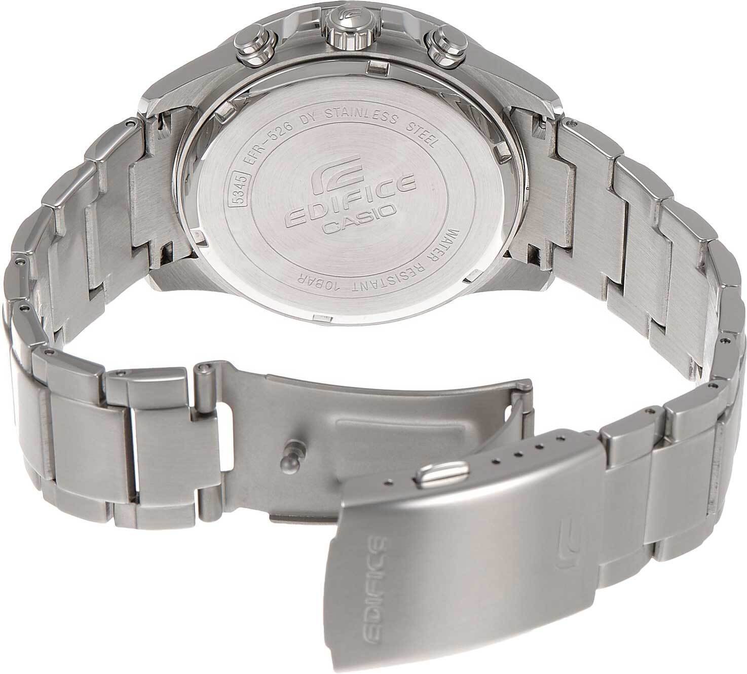 Мужские кварцевые аналоговые часы-хронограф с секундомером. Коллекция Edifice. Центральные часовая, минутная и секундная стрелки. Красный циферблат с часовыми метками в виде штрихов. Стрелки и метки с люминесцентным покрытием, которое светится в темноте после непродолжительного воздействия света. Окошко даты в позиции 3 ч. Секундомер с точностью показаний 1/10с и временем измерения 1ч. Режимы измерения: прошедшее время, промежуточное время, два финишных результата. Устойчивое к мелким механическим повреждениям минеральное стекло. Круглый корпус из нержавеющей стали. Размер корпуса 43,8 мм на 48,5 мм, толщина 11,6 мм. Переводная головка с защитой. Задняя крышка с винтовым фиксатором. Стальной браслет с раскладывающейся застежкой с фиксатором. Батарейка рассчитана на 2 года. Водонепроницаемость WR100 (плавание и погружение без акваланга). Вес примерно 149 г.