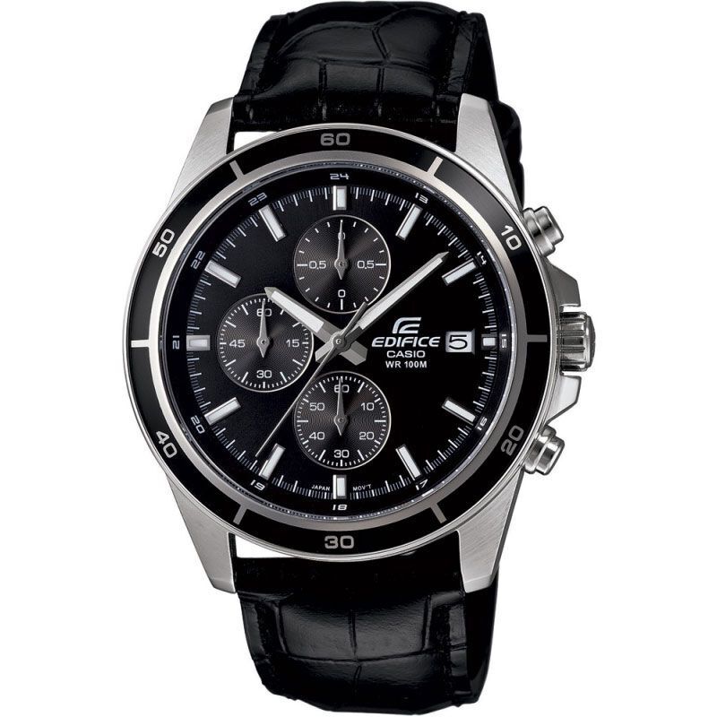Мужские кварцевые аналоговые часы-хронограф с секундомером. Коллекция Edifice. Центральные часовая, минутная и секундная стрелки. Белый циферблат с часовыми метками в виде штрихов. Стрелки и метки с люминесцентным покрытием, которое светится в темноте после непродолжительного воздействия света. Окошко даты в позиции 3 ч. Секундомер с точностью показаний 1/10с и временем измерения 1ч. Режимы измерения: прошедшее время, промежуточное время, два финишных результата. Устойчивое к мелким механическим повреждениям минеральное стекло. Круглый корпус из нержавеющей стали. Размер корпуса 43,8 мм на 48,5 мм, толщина 11,6 мм. Переводная головка с защитой. Задняя крышка с винтовым фиксатором. Коричневый кожаный ремешок с классической застёжкой buckle. Батарейка рассчитана на 2 года. Водонепроницаемость WR100 (плавание и погружение без акваланга). Вес примерно 74 г.