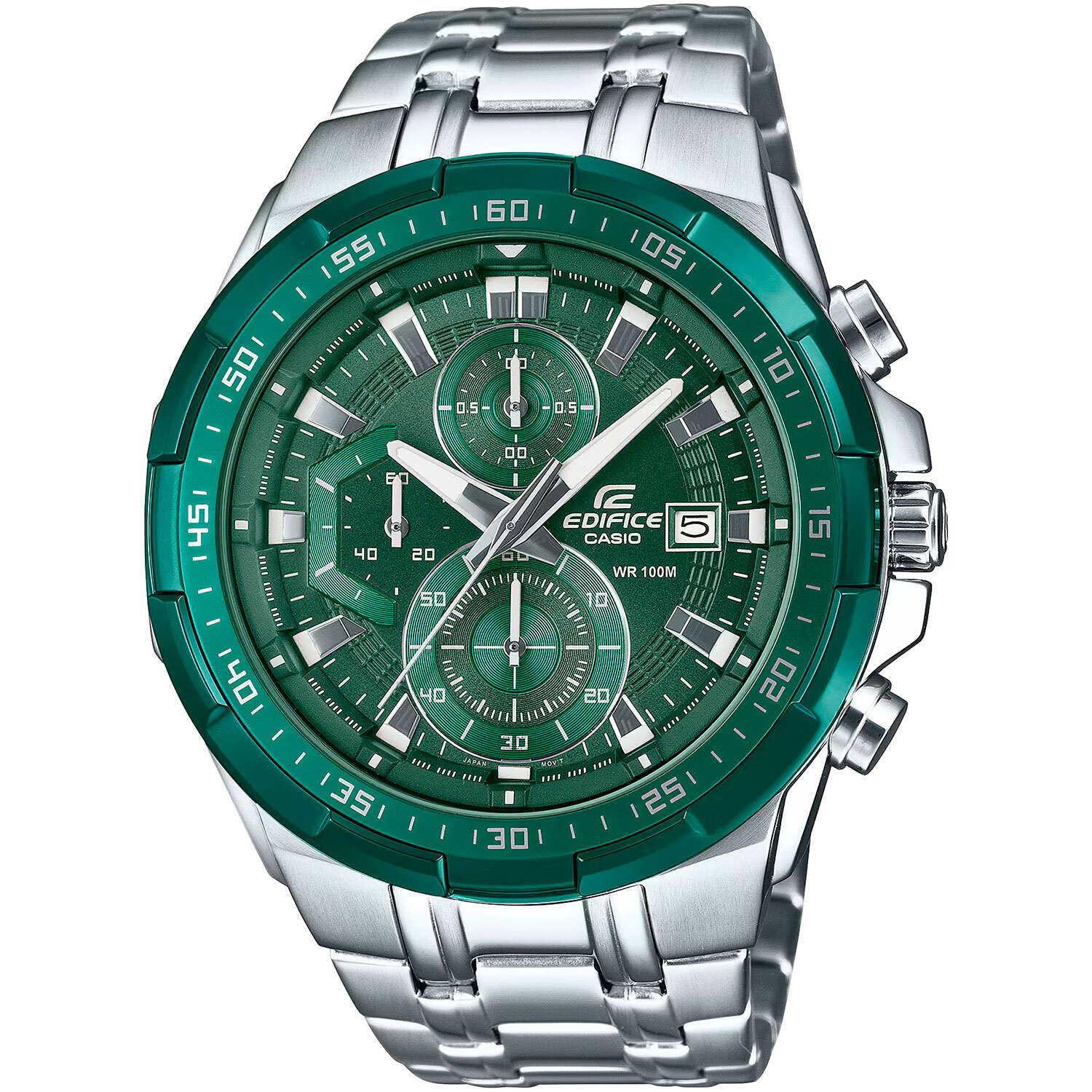 Мужские кварцевые аналоговые часы-хронограф с секундомером. Коллекция Edifice. Центральные часовая, минутная и секундная стрелки. Зелёный циферблат с часовыми метками в виде штрихов. Стрелки и метки с люминесцентным покрытием, которое светится в темноте после непродолжительного воздействия света. Окошко даты в позиции 3 ч. Секундомер с точностью показаний 1/10с и временем измерения 1ч. Режимы измерения: прошедшее время, промежуточное время, два финишных результата. Устойчивое к мелким механическим повреждениям минеральное стекло. Круглый корпус из нержавеющей стали с зелёным IP покрытием на безеле. Размер корпуса 49,5 мм на 54,1 мм, толщина 11,7 мм. Минутная шкала на безеле. Переводная головка с защитой. Задняя крышка с винтовым фиксатором. Стальной браслет с раскладывающейся застежкой. Батарейка рассчитана на 2 года. Водонепроницаемость WR100 (часы подходят для плавания с маской и трубкой, обычного плавания). Вес около 184 г.