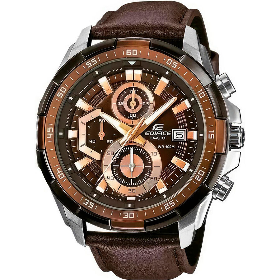 Мужские кварцевые аналоговые часы-хронограф с секундомером. Коллекция Edifice. Центральные часовая, минутная и секундная стрелки. Коричневый циферблат с часовыми метками в виде штрихов. Стрелки и метки с люминесцентным покрытием, которое светится в темноте после непродолжительного воздействия света. Окошко даты в позиции 3 ч. Секундомер с точностью показаний 1/10с и временем измерения 1ч. Режимы измерения: прошедшее время, промежуточное время, два финишных результата. Устойчивое к мелким механическим повреждениям минеральное стекло. Круглый корпус из нержавеющей стали. Размер корпуса 49,5 мм на 54,1 мм, толщина 11,7 мм. Переводная головка с защитой. Задняя крышка с винтовым фиксатором.. Коричневый кожаный ремешок с классической застёжкой buckle. Батарейка рассчитана на 2 года. Водонепроницаемость WR100 (плавание и погружение без акваланга). Вес примерно 97 г.