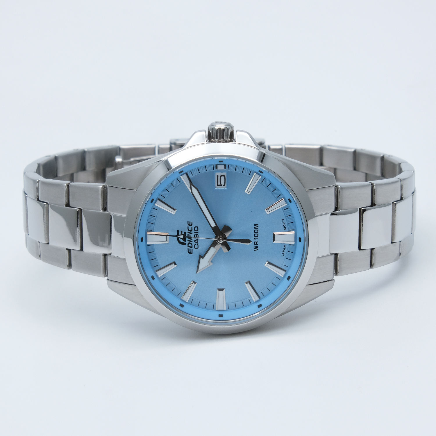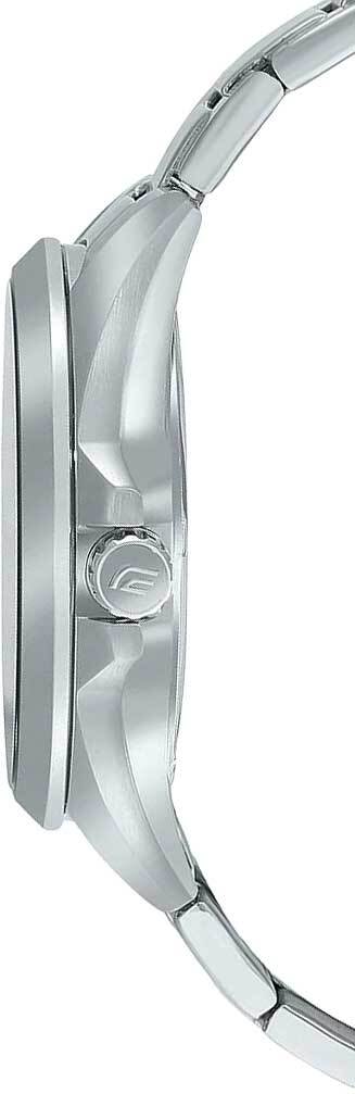 Мужские кварцевые часы с аналоговым отображением времени. Коллекция Edifice. Центральные часовая, минутная и секундная стрелки. Голубой циферблат с часовыми метками в виде штрихов. Стрелки и метки с люминесцентным покрытием, которое светится в темноте после непродолжительного воздействия света. Окошко даты в позиции 3 часов. Устойчивое к мелким механическим повреждениям минеральное стекло. Круглый стальной корпус размером 48 мм на 42 мм, толщиной 10,9 мм. Переводная головка с защитой. Стальной браслет с тройной раскладывающейся застежкой. Батарейка рассчитана на 3 года. Завинчивающаяся задняя крышка. Водонепроницаемость WR100 (часы подходят для плавания с маской и трубкой, обычного плавания). Вес около 125 г.