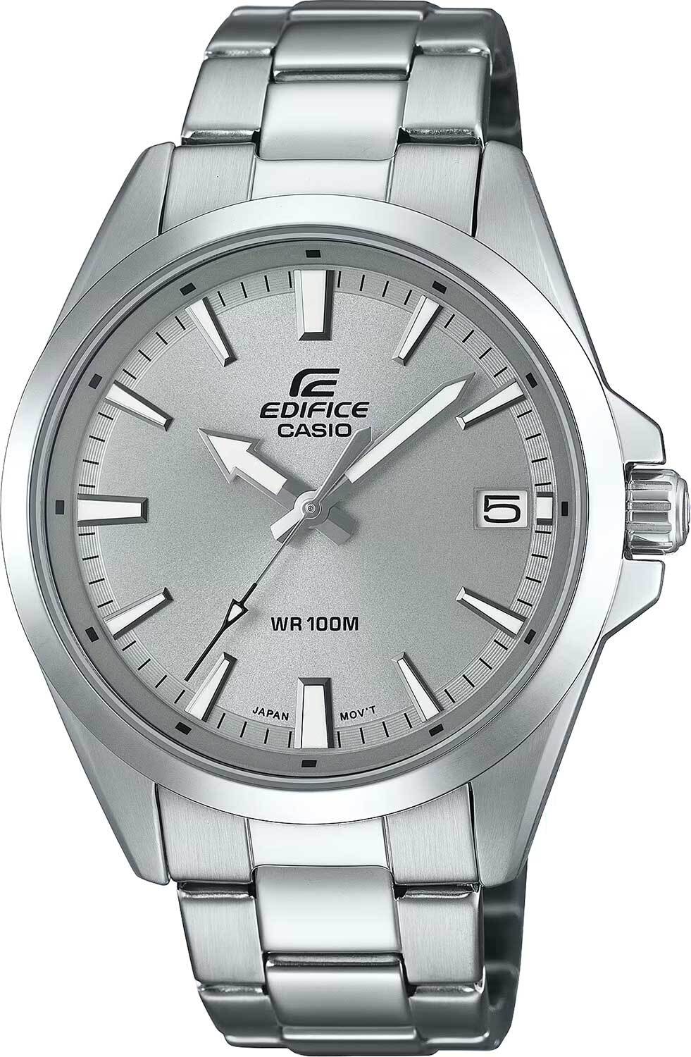 Мужские кварцевые часы с аналоговым отображением времени. Коллекция Edifice. Центральные часовая, минутная и секундная стрелки. Серебристый циферблат с часовыми метками в виде штрихов. Стрелки и метки с люминесцентным покрытием, которое светится в темноте после непродолжительного воздействия света. Окошко даты в позиции 3 часов. Устойчивое к мелким механическим повреждениям минеральное стекло. Круглый стальной корпус размером 48 мм на 42 мм, толщиной 10,9 мм. Переводная головка с защитой. Стальной браслет с тройной раскладывающейся застежкой. Батарейка рассчитана на 3 года. Завинчивающаяся задняя крышка. Водонепроницаемость WR100 (часы подходят для плавания с маской и трубкой, обычного плавания). Вес около 125 г.