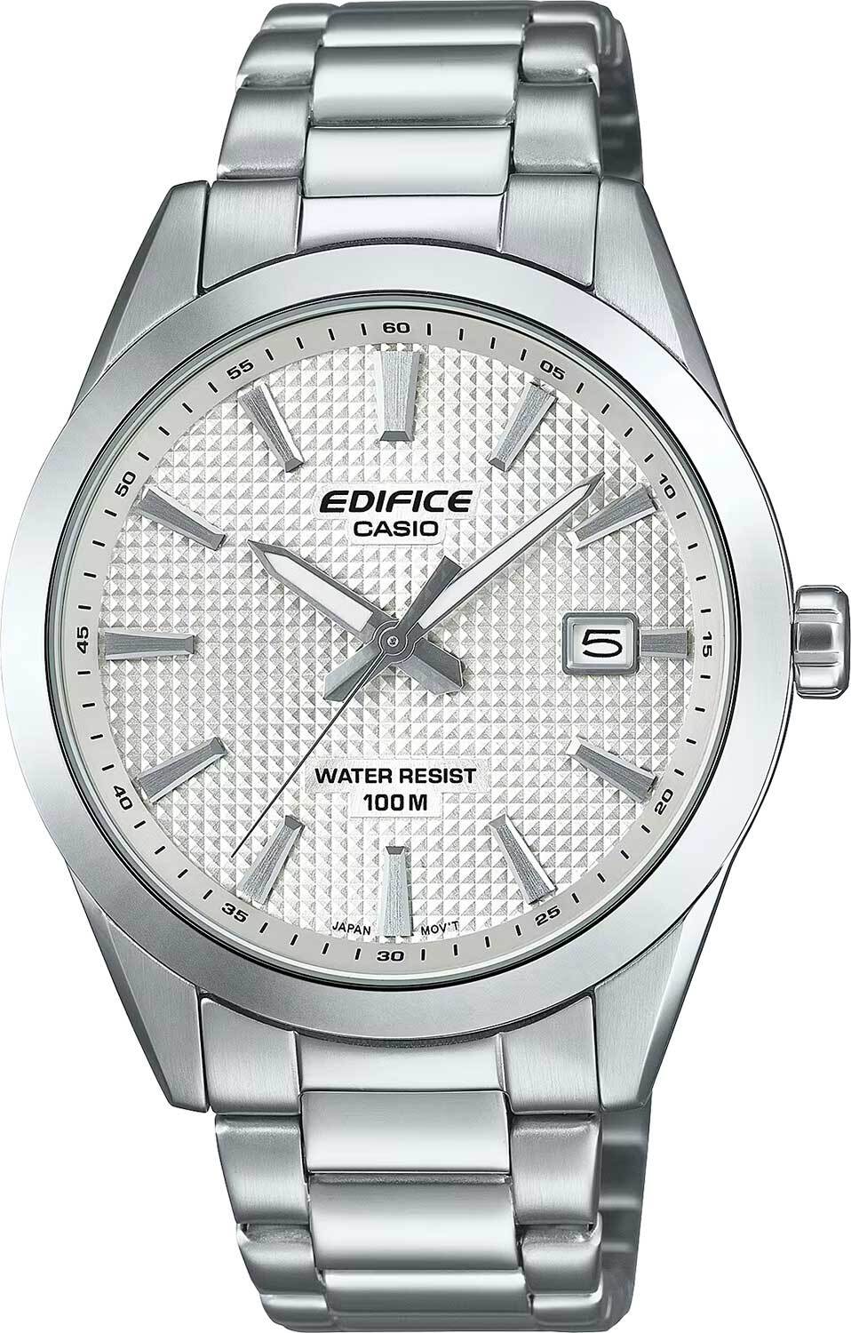 Мужские кварцевые часы с аналоговым отображением времени. Коллекция Edifice. Центральные часовая, минутная и секундная стрелки. Белый текстурный циферблат с метками в виде штрихов украшен узором «Clous de Paris». Стрелки и часовые метки метки с люминесцентным покрытием, которое светится в темноте после непродолжительного воздействия света. Окошко даты в позиции 3 часов. Минутная шкала по внешнему краю циферблата. Устойчивое к мелким механическим повреждениям минеральное стекло. Круглый стальной корпус размером 40 мм на 47,5 мм, толщиной 10 мм. Стальной браслет с тройной раскладывающейся застежкой. Батарейка рассчитана на 3 года. Завинчивающаяся задняя крышка. Водонепроницаемость WR100 ( (часы подходят для плавания с маской и трубкой, обычного плавания). Вес около 110 г.