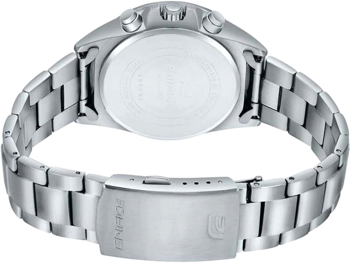 Мужские кварцевые аналоговые часы-хронограф с секундомером. Коллекция Edifice. Центральные часовая, минутная и секундная стрелки. Синий циферблат с часовыми метками в виде штрихов. Стрелки и метки с люминесцентным покрытием, которое светится в темноте после непродолжительного воздействия света. Окошко даты между метками 4 и 5 часов. Секундомер с точностью показаний 1 с и временем измерения 30 мин. Режимы измерения: прошедшее время, промежуточное время, два финишных результата. 12-ти и 24-х часовой формат отображения времени (дополнительный малый циферблат в позиции 3 ч). Устойчивое к мелким механическим повреждениям минеральное стекло. Круглый корпус из нержавеющей стали. Размер корпуса 49,5 мм на 43,9мм, толщина 10,8мм. Переводная головка с защитой. Завинчивающаяся задняя крышка. Стальной браслет с раскладывающейся застежкой. Батарейка рассчитана на 3 года. Водонепроницаемость WR100 (плавание и погружение без акваланга). Вес примерно 130 г.