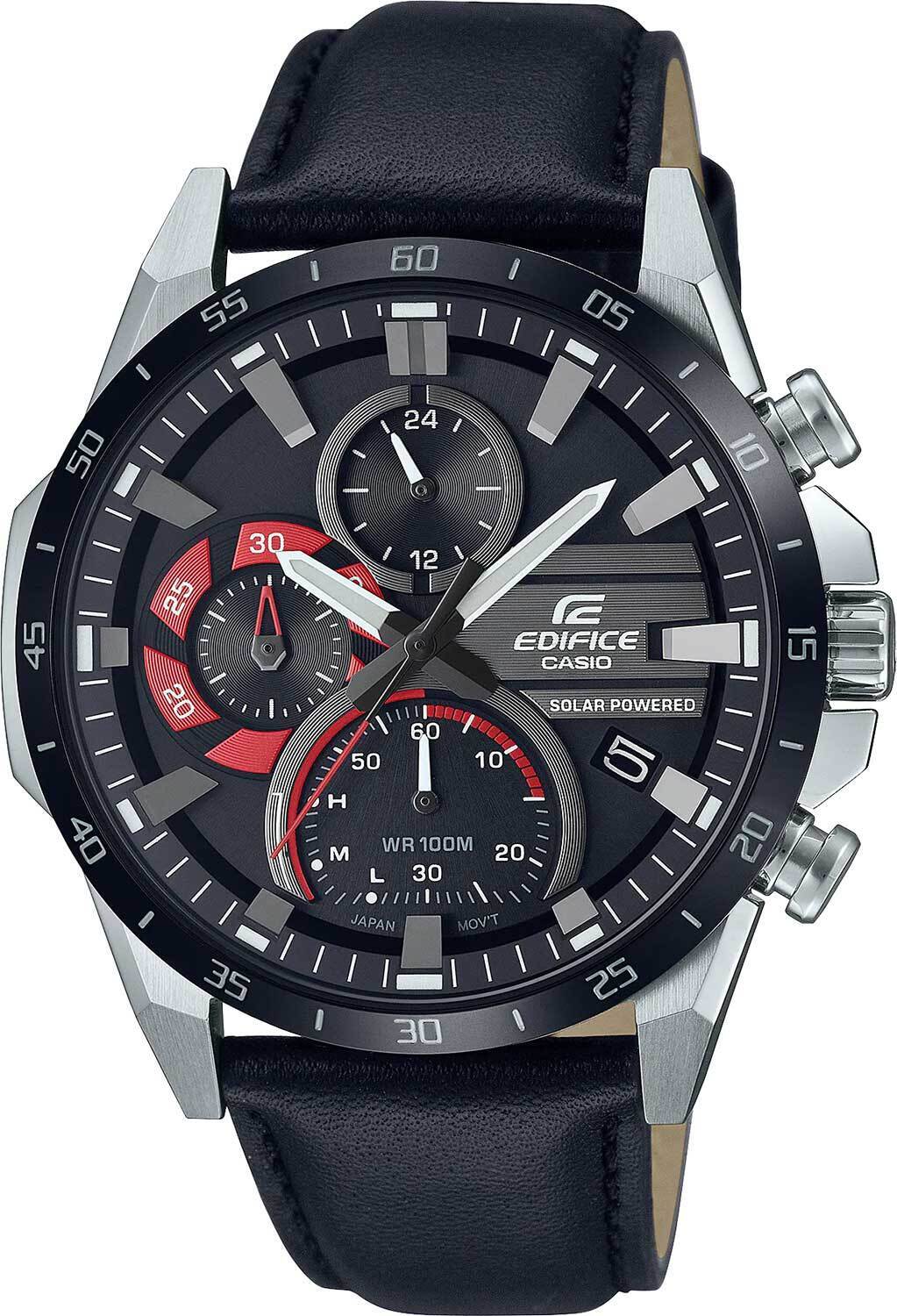 Мужские кварцевые аналоговые наручные часы. Серия Edifice. Питание от солнечной энергии Tought Solar- источником питания служит светочувствительная панель и аккумулятор, который заряжается от солнечных лучей. Индикаторы уровня заряда аккумулятора (H/M/L). Функция оповещения о низком уровне заряда аккумулятора - при низком уровне заряда аккумулятора секундная стрелка двигается с интервалом в 2 секунды. Время работы батареи без подзарядки до 5 месяцев. Центральные часовая, минутная и секундная стрелки. Чёрный циферблат с часовыми индексами в виде штрихов. Стрелки и метки с люминесцентным покрытием, которое светится в темноте после непродолжительного воздействия света. Апертура даты в позиции 4 ч. Секундомер с точностью показаний 1 с и временем измерения 30 минут. Режимы измерения: прошедшее время, промежуточное время, два финишных результата. 12-ти и 24-х часовой формат отображения времени (стрелочный указатель на дополнительном малом циферблате в позиции 12ч). Устойчивое к мелким механическим повреждениям минеральное стекло. Корпус из нержавеющей стали с частичным покрытием чёрного цвета. Размеры корпуса 45,5 мм на 49,5мм, толщина 12,5мм. Переводная головка с защитой. Задняя крышка с винтовым фиксатором. Чёрный кожаный ремешок с классической застёжкой buckle. Водонепроницаемость WR100 (плавание и погружение без акваланга). Вес около 74г.