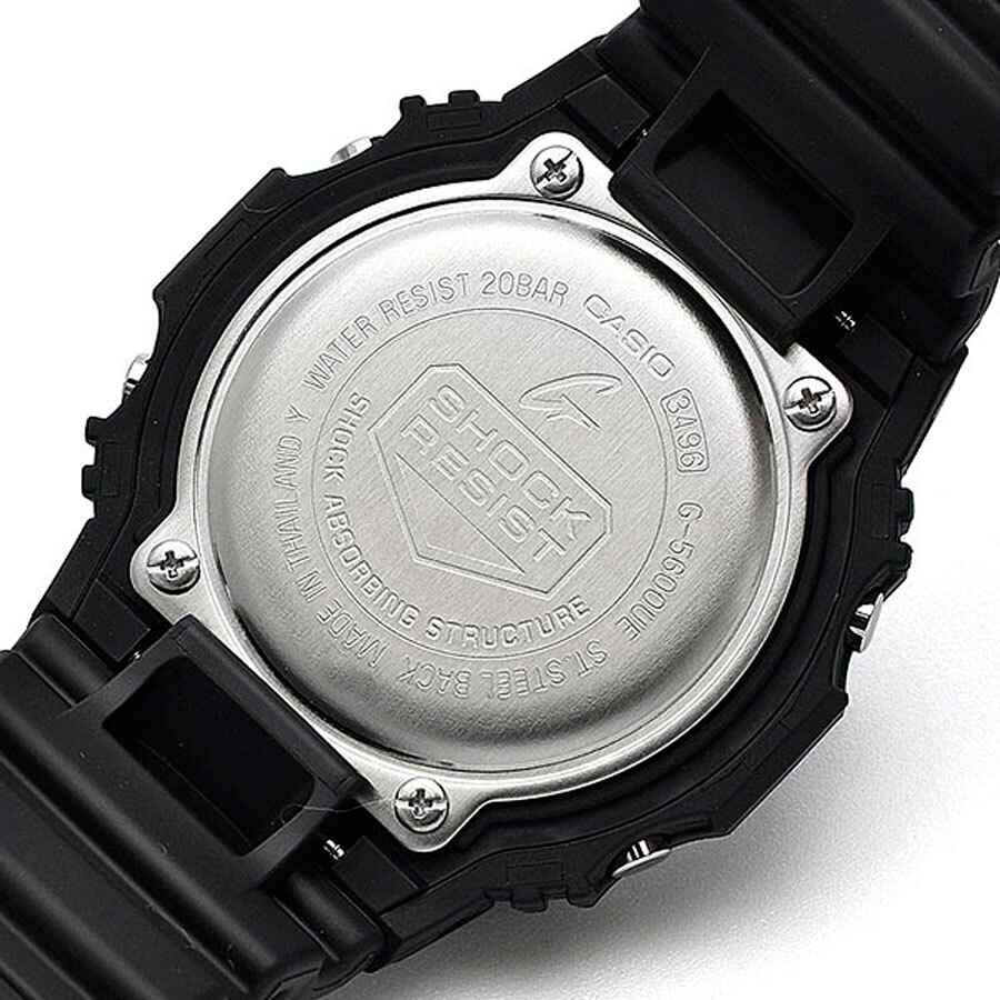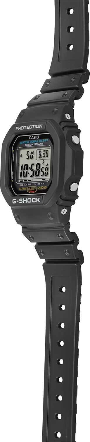 Мужские кварцевые электронные наручные часы. Серия G-Shock. Питание от солнечной энергии Tought Solar- источником питания служит светочувствительная панель и аккумулятор, который заряжается от солнечных лучей. Функция автоматического сохранения энергии (отключает дисплей). Время работы аккумулятора без подзарядки около 12 месяцев, при включенной функции сохранения энергии около 22 месяцев. Индикатор уровня заряда батареи. Противоударный корпус защищает механизм часов от ударов и вибрации. Циферблат подсвечивается светодиодом, при недостаточном освещении поворот руки обеспечит автоматическое включение подсветки дисплея. Настраиваемое послесвечение 1,5 или 3с. 12-ти и 24-х часовой формат отображения времени. Секундомер с точностью измерения 1/100 секунды (первые 60 минут), и 1 секунда (через 60 минут) и временем измерения 24ч. Режимы измерения: прошедшее время, промежуточное время, два финишных результата. Таймер обратного отсчета от 1с до 24ч. Мировое время – 48 городов (31 часовой пояс), всемирное координированное время (UTC). Переключение между домашним и мировым временем. Возможность выбора до 5 городов в качестве избранных в WorldTime. Переход на зимнее и летнее время, возможность включения/отключения данной функции. Автоматический календарь до 2099г. Отображение дней недели на шести языках. Функция включения/отключения звука. 5 ежедневных будильников (один с функцией повтора сигнала), ежечасный сигнал. Прямоугольный корпус из полимерного пластика чёрного цвета. Размеры корпуса 43,2 мм на 46,7мм, толщина 12,7мм. Устойчивое к мелким механическим повреждениям минеральное стекло. Стальная задняя крышка. Чёрный пластиковый ремешок с классической застежкой buckle. Водонепроницаемость WR200 (плавание и ныряние без акваланга). Вес около 51г.