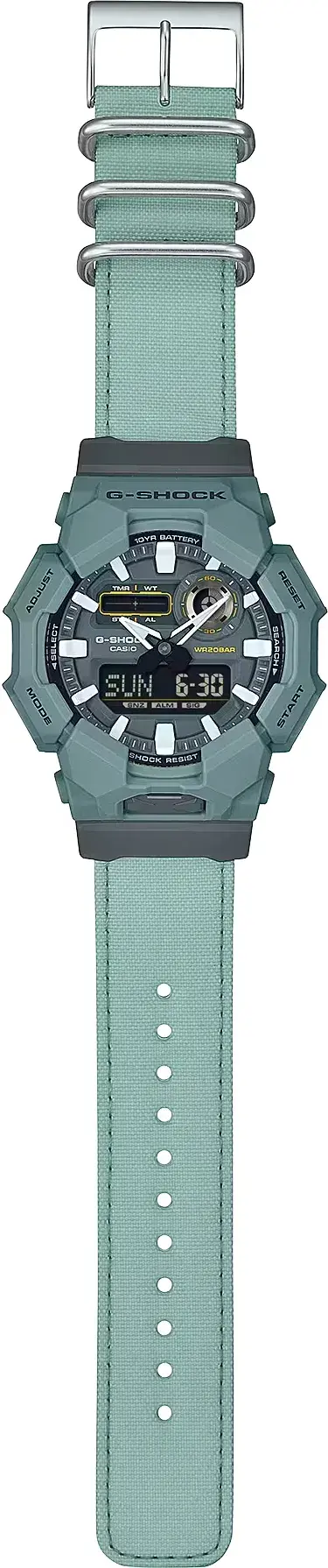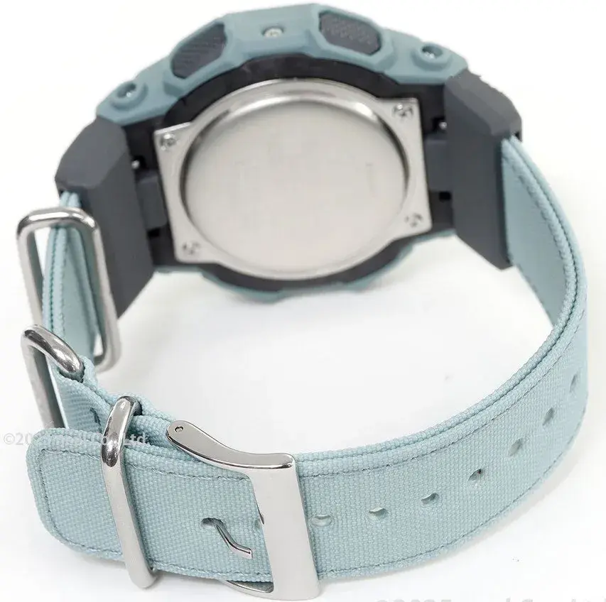 Мужские кварцевые аналого-цифровые наручные часы. Серия G-Shock. Противоударный корпус из биопластика (изготавливается из возобновляемых органических ресурсов) с углеродными волокнами (структура Carbon Core Guard) более прочный и в то же время более легкий, защищает механизм часов от ударов и вибраций. Циферблат подсвечивается светодиодом. Настройка продолжительности подсветки 1,5 или 3 секунды, послесвечение. Светящееся покрытие стрелок обеспечивает длительное послесвечение в темноте после короткого воздействия света. 12-ти и 24-х часовой формат отображения времени. Секундомер с точностью показаний 1/100 с и временем измерения 24 часа. Режимы измерения: прошедшее время, промежуточное время, два финишных результата. Таймер обратного отсчета от от 1 мин до 1 ч. Мировое время - 31 часовой пояс (48 городов), всемирное координированное время (UTC), включение/отключение летнего времени. 5 ежедневных будильников ( один с функцией повтора сигнала ), ежечасный сигнал. Функция перемещения стрелок для удобного просмотра информации на цифровом экране. Функция отключения/включения звука кнопок. Автоматический календарь до 2099 года. Усиленный углеродными волокнами пластиковый корпус зелёного цвета. Размер корпуса 51,9 мм на 55,1мм, толщина 17,5мм. Устойчивое к мелким механическим повреждениям минеральное стекло. Зелёный тканевый ремешок Cordura с классической застежкой buckle. Ткань Кордура (CORDURA®) - плотная нейлоновая ткань производства компании INVISTA, отличается повышенной прочностью на разрыв, устойчивостью к истиранию и долговечностью. Окрашен ремешок натуральным красителем от Food Textile — проекта по переработке пищевых отходов для создания природных красителей для тканей. Батарея рассчитана на 10 лет. Водонепроницаемость 200WR (плавание и ныряние без акваланга). Вес около 75 г.