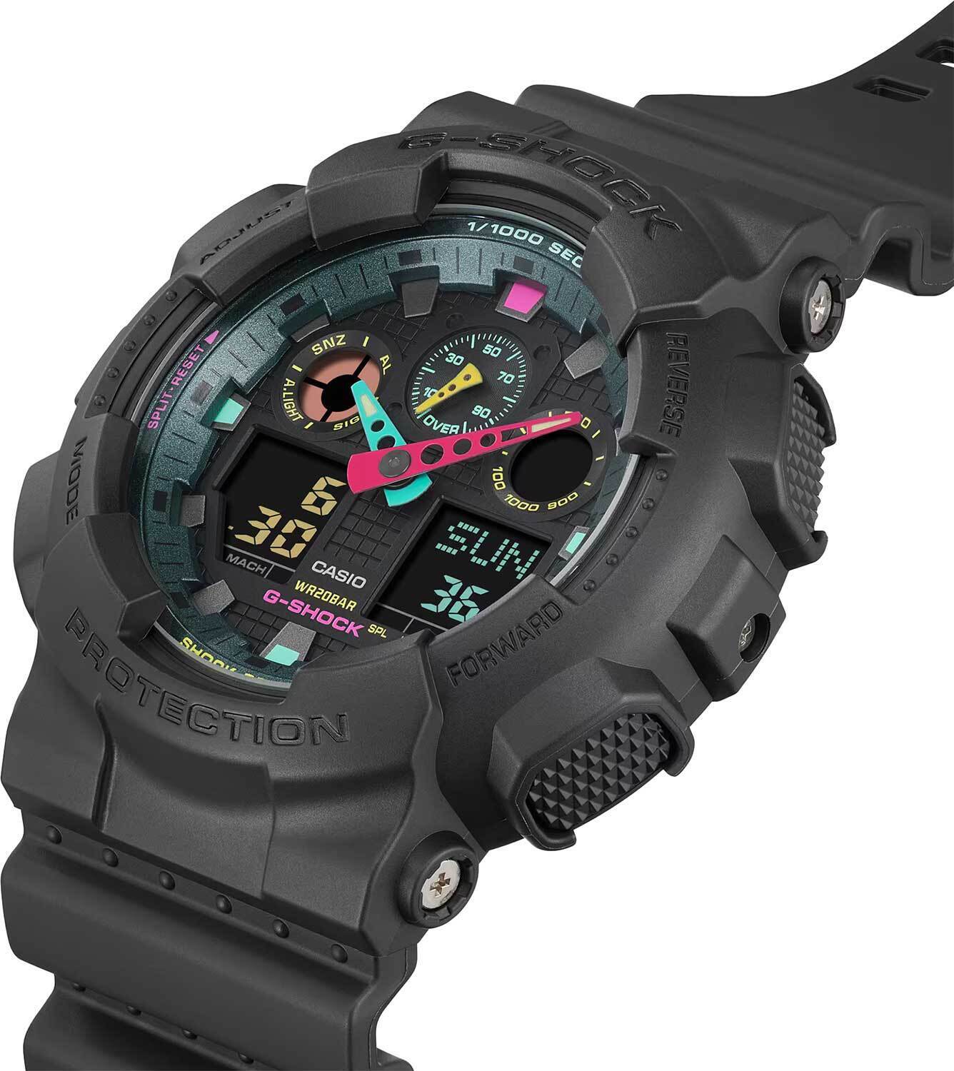Мужские кварцевые наручные часы c аналогово-цифровым отображением времени. Серия Casio G-Shock. Противоударный корпус защищает механизм часов от ударов и вибрации. Часы созданы с защитой от воздействия магнитных полей. Автоматическая светодиодная подсветка — при недостаточном освещении поворот руки включает подсветку циферблата, выбор продолжительности подсветки 1,5 секунды или 3 секунды) послесвечение. Мировое время – 48 городов (29 часовых поясов), всемирное координированное время (UTC). Автоматический переход на зимнее и летнее время, возможность включения/отключения данной функции. 12-ти и 24-х часовой формат отображения времени. Секундомер с точностью показаний 1/1000 с и временем измерения 100 ч. Режимы измерения: пройденное время, время круга, промежуточное время. Расчет скорости по выбранной дистанции. Таймер обратного отсчета от 1 мин до 24 ч (с интервалом в 1 минуту и с интервалом в 1 час) с автоповтором. 5 ежедневных будильников, один с функцией повтора сигнала (Snooze), ежечасный сигнал. Автоматический календарь до 2099 года. Круглый корпус из полимерного пластика чёрного цвета. Устойчивое к мелким механическим повреждениям минеральное стекло. Чёрный пластиковый ремешок с классической застежкой buckle. Приблизительный срок службы батареи 2 года. Водонепроницаемость 200 WR (плавание и ныряние без акваланга). Вес около 72 г.