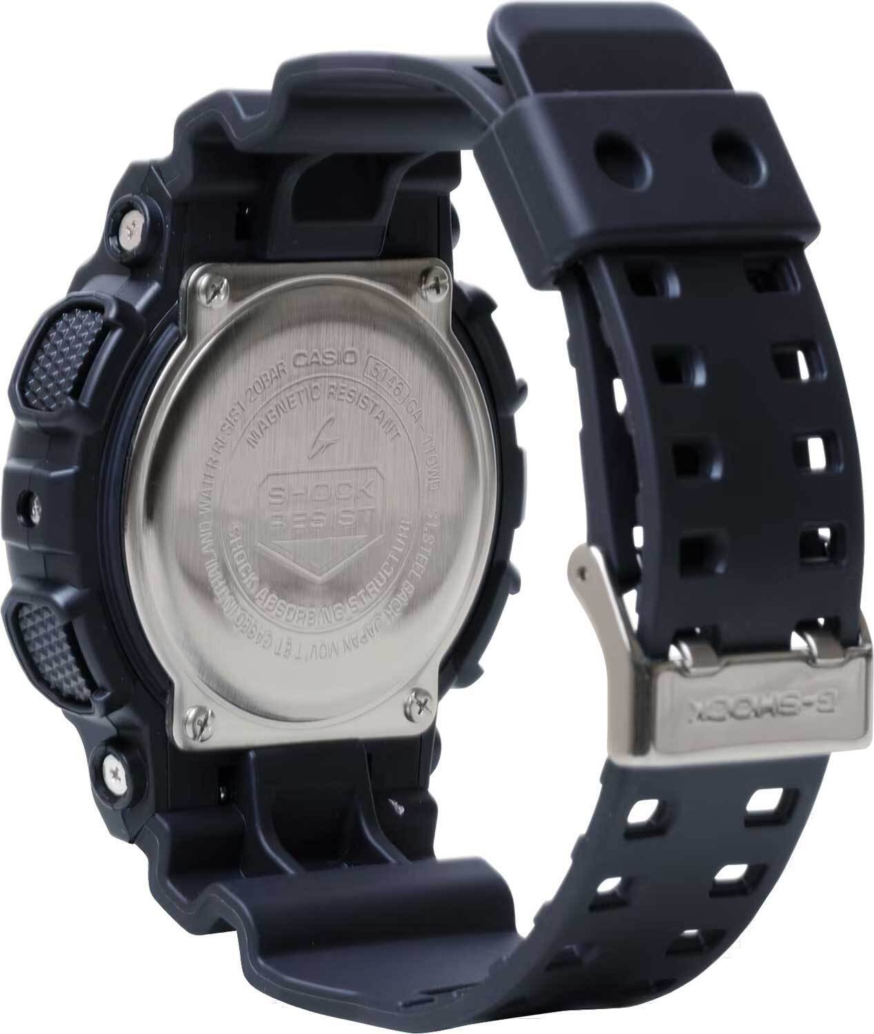Мужские кварцевые наручные часы c аналого-цифровым отображением времени. Серия Casio G-Shock. Противоударный корпус защищает механизм часов от ударов и вибрации. Часы созданы с защитой от воздействия магнитных полей. Автоматическая светодиодная подсветка — при недостаточном освещении поворот руки включает подсветку циферблата, выбор продолжительности подсветки 1,5 или 3 секунды, послесвечение. Необритовое светонакопительное покрытие обеспечивает длительное послесвечение в темноте даже после кратковременного воздействия света. Мировое время – 48 городов (29 часовых поясов), всемирное координированное время (UTC). Автоматический переход на зимнее и летнее время, возможность включения/отключения данной функции. Переключение между домашним и мировым временем. 12-ти и 24-х часовой формат отображения времени. Секундомер с точностью показаний 1/1000 с и временем измерения 100 ч. Режимы измерения:прошедшее время, промежуточное время, два финишных результата. Расчет скорости по выбранной дистанции. Таймер обратного отсчета от 1 мин до 24 ч с автоповтором. 5 ежедневных будильников, один с функцией повтора сигнала (Snooze), ежечасный сигнал. Автоматический календарь до 2099 года. Круглый корпус из полимерного пластика чёрного цвета. Устойчивое к мелким механическим повреждениям минеральное стекло. Пластиковый ремешок чёрного цвета с классической застежкой Buckle. Приблизительный срок службы батареи 2 года. Водонепроницаемость 200 WR (плавание и ныряние без акваланга). Вес около 72 г.