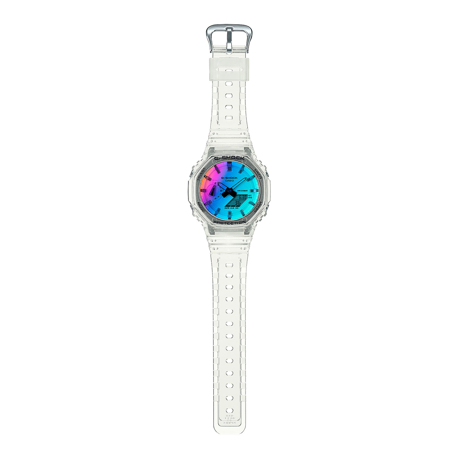 Кварцевые часы. Двойная светодиодная подсветка с настраиваемой длительностью свечения (1,5 или 3 секунды), послесвечение, цвет: белый. Функция секундомера с точностью показаний 1/100 секунды и пределом измерения 24 часа. Таймер - время можно предварительно настроить от 1 секунды и до 24 часов. Часы могут затем автоматически начать отсчет в обратную сторону в установленное время. Идеальное решение для людей, которым необходимо ежедневно принимать лекарства или выполнять промежуточные упражнения (тренировки). Функция мирового времени (31 часовая зона, 48 городов). 5 ежедневных будильников. Ежечасный сигнал. Включение/выключение звука кнопок. Функция перемещения стрелок. Автоматический календарь (до 2099 года). 12/24х часовой формат времени. Белый циферблат. Ударопрочная конструкция защищает механизм часов от ударов и вибрации. Корпус из прозрачного полимерного материала. Размер корпуса составляет 45,4 х 48,5 х 11,8 мм. Прозрачный ремешок из полимерного материала, стандартная застежка. Прочное специально обработанное минеральное стекло с радужным напылением устойчивое к мелким механическим повреждениям. Водостойкость WR 200 (погружение с аквалангом). Вес 51 г.