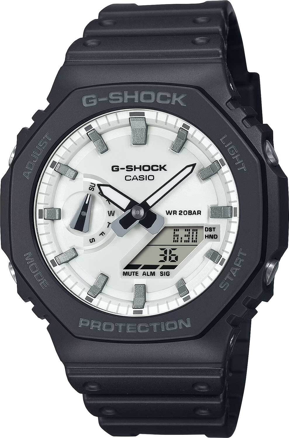 Мужские кварцевые аналого-цифровые наручные часы. Серия G-Shock. Противоударный пластиковый корпус с углеродными волокнами (структура Carbon Core Guard) более прочный и в то же время более легкий, защищает механизм часов от ударов и вибраций. Двойная светодиодная подсветка обеспечивает подсветку не только цифрового дисплея, но и аналогового циферблата. Настройка продолжительности подсветки 1,5 или 3 секунды, послесвечение. Необритовое светонакопительное покрытие обеспечивает длительное послесвечение в темноте даже после кратковременного воздействия света. 12-ти и 24-х часовой формат отображения времени. Секундомер с точностью показаний 1/100 с (первый час) и 1 с (после первого часа) и временем измерения 24 часа. Режимы измерения: прошедшее время, промежуточное время, два финишных результата. Таймер обратного отсчета от 1 секунды до 24 часов с автоповтором. Мировое время - 31 часовой пояс (48 городов), всемирное координированное время (UTC), включение/отключение летнего времени. 5 ежедневных будильников, ежечасный сигнал. Функция перемещения стрелок для удобного просмотра информации на цифровом экране. Ретроградный указатель дня недели. Функция отключения/включения звука кнопок. Автоматический календарь до 2099 года. Усиленный углеродными волокнами пластиковый восьмиугольный корпус чёрного цвета. Размер корпуса 45,4 мм на 48,5мм, толщина 11,8мм. Устойчивое к мелким механическим повреждениям минеральное стекло. Чёрный пластиковый ремешок со стандартной застёжкой Buckle. Примерный срок службы батареи 3 года. Водонепроницаемость 200WR (плавание и ныряние без акваланга). Вес около 51 г.