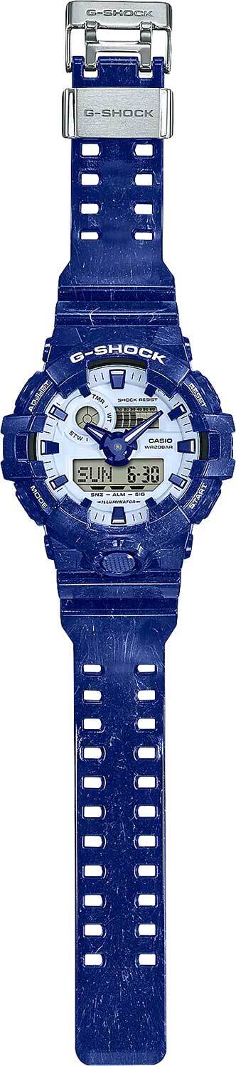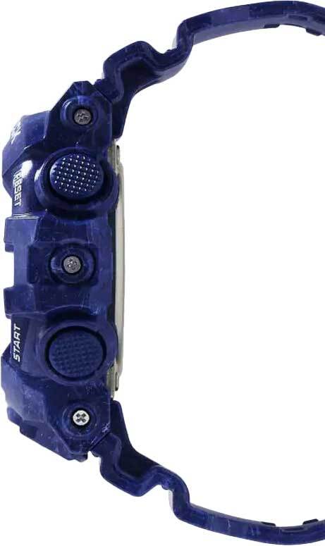 Мужские кварцевые аналого-цифровые наручные часы. Серия Casio G-Shock Chinese Porcelain Ceramic. Цветовая гамма часов вдохновлена знаменитым китайским фарфором. Ударопрочная конструкция корпуса защищает механизм часов от ударов и вибрации. 12-ти и 24-х часовой формат отображения времени. Циферблат подсвечивается светодиодом, настройка продолжительности подсветки 1,5 или 3 секунды. Светящееся покрытие стрелок обеспечивает длительное послесвечение в темноте после короткого воздействия света. Секундомер с точностью показаний 1/100 с и временем измерения 24 ч. Режимы измерения: прошедшее время, промежуточное время, два финишных результата; быстрое включение секундомера из режима Текущего времени. Таймер обратного отсчета от 1 мин до 1 ч (с интервалом в 1 минуту). Мировое время - 48 городов (31 часовой пояс), всемирное координированное время (UTC), включение/выключение перехода на летнее время, быстрая замена текущего времени на мировое. 5 ежедневных будильников (один с функцией повтора сигнала), ежечасный сигнал. Включение/выключение звука кнопок. Функция перемещения стрелок для удобного просмотра информации на цифровых экранах. Автоматический календарь до 2099 года. Круглый корпус из полимерного пластика синего цвета. Размеры корпуса 53.4 мм на 57.5 мм, толщина 18.5 мм. Устойчивое к мелким механическим повреждениям минеральное стекло. Пластиковый ремешок синего цвета со стандартной застёжкой Buckle. Задняя крышка украшена гравировкой дракона. Срок службы батарейки около 5 лет. Водозащищённость 200 WR (плавание и ныряние без акваланга). Вес около 75 г. В комплекте пластиковая стилизованная фигурка человечка со скейтом.