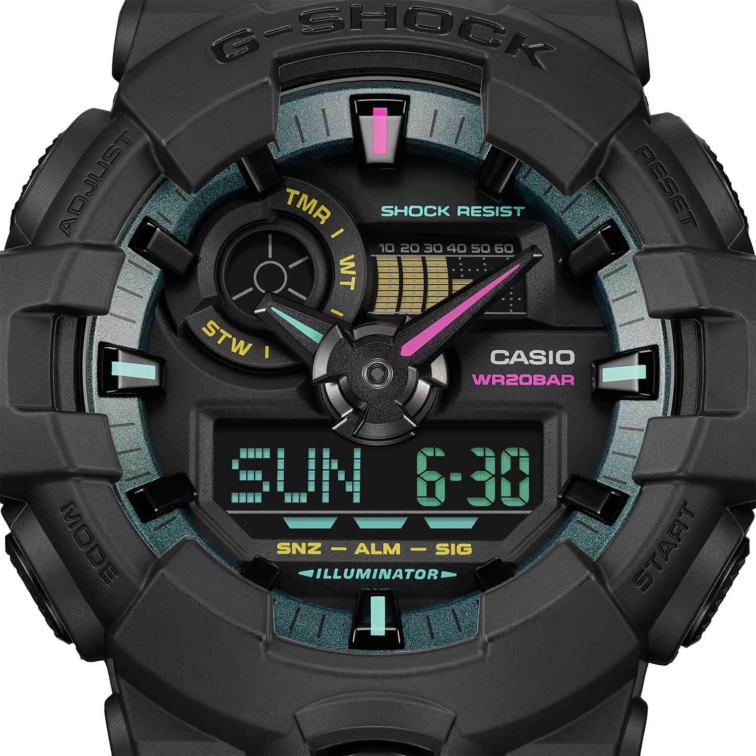 Мужские кварцевые аналогово-цифровые наручные часы. Серия Casio G-Shock. Матово-черный безель и ремешок стильно контрастируют с яркими синими, розовыми и желтыми штрихами на стрелках, часовых маркерах и циферблате. Цветовое решение дизайна часов вдохновлено виртуальным миром. Ударопрочная конструкция корпуса защищает механизм часов от ударов и вибрации. 12-ти и 24-х часовой формат отображения времени. Циферблат подсвечивается светодиодом, настройка продолжительности подсветки 1,5 или 3 секунды. Секундомер с точностью показаний 1/100 с и временем измерения 24 ч. Режимы измерения: прошедшее время, промежуточное время, два финишных результата; быстрое включение секундомера из режима Текущего времени. Таймер обратного отсчета от 1 мин до 1 ч (с интервалом в 1 минуту). Мировое время - 48 городов (31 часовой пояс), всемирное координированное время (UTC), включение/выключение перехода на летнее время, быстрая замена текущего времени на мировое. 5 ежедневных будильников, один с функцией повтора сигнала; ежечасный сигнал. Включение/выключение звука кнопок. Функция перемещения стрелок для удобного просмотра информации на цифровом экране. Автоматический календарь до 2099 года. Круглый корпус из биопластика (изготавливается из возобновляемых органических ресурсов) чёрного цвета. Размеры корпуса 53.4 мм на 57.5 мм, толщина 18.5 мм. Устойчивое к мелким механическим повреждениям минеральное стекло. Чёрный ремешок из биопластика со стандартной застёжкой Buckle. Примерный срок службы батарейки около 5 лет. Водозащищённость 200 WR (плавание и ныряние бкз акваланга). Вес около 75 г.