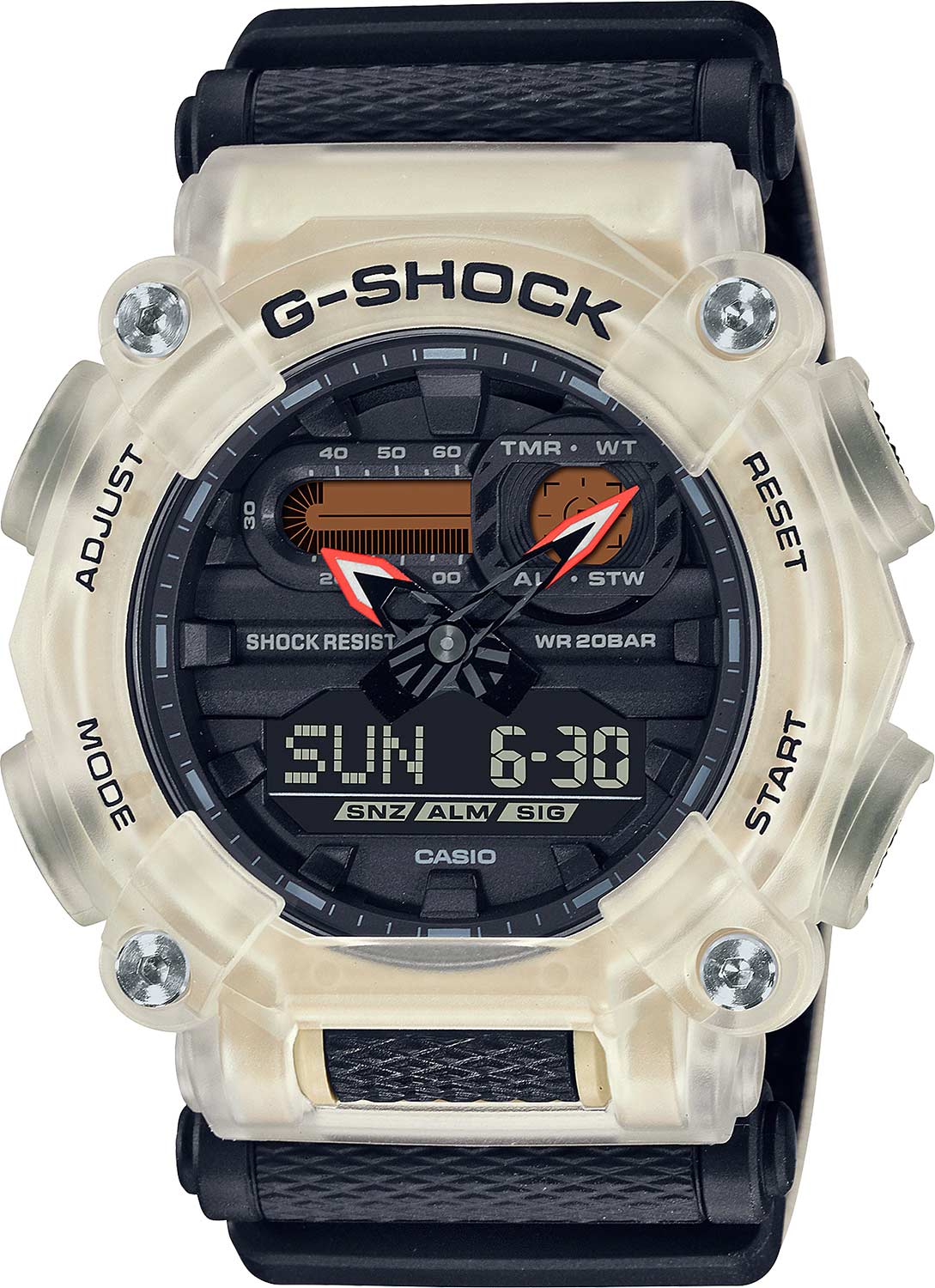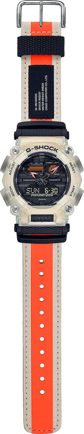 Мужские кварцевые наручные часы с аналого-цифровым отображением времени. Коллекция Casio G-Shock. Противоударный корпус защищает внутренний модуль часов от повреждений и деформаций при ударах. Циферблат подсвечивается ярким светодиодом, настройка продолжительности подсветки 1,5 или 3 секунды, послесвечение. 12-ти и 24-х часовой формат отображения времени. Секундомер с точностью показаний 1/100 секунды и временем измерения 24 часа. Режимы измерения: прошедшее время, промежуточное время, два финишных результата, быстрое включение секундомера из режима Текущего времени. Таймер обратного отсчета от 1 минуты до 60 минут (с интервалом в 1 минуту). Мировое время – 48 городов (31 часовой пояс), всемирное координированное время (UTC), переключение между домашним и мировым временем, включение/отключение летнего времени. Автоматический календарь до 2099 г. 5 ежедневных будильников, один с функцией повтора сигнала Snooze, сигнал начала часа. Функция отключения/включения звука кнопок. Функция перемещения стрелок для удобного просмотра информации на цифровом экране. Круглый корпус из полупрозрачного полимерного пластика. Размеры корпуса 49,5 мм на 52,8мм, толщина 16,9мм. Минеральное стекло устойчивое к мелким механическим повреждениям. Оранжевый тканевый ремешок с классической застежкой buckle. Батарея рассчитана на 7 лет. Водонепроницаемость 200 WR (плавание и ныряние без акваланга). Вес около 65 г.