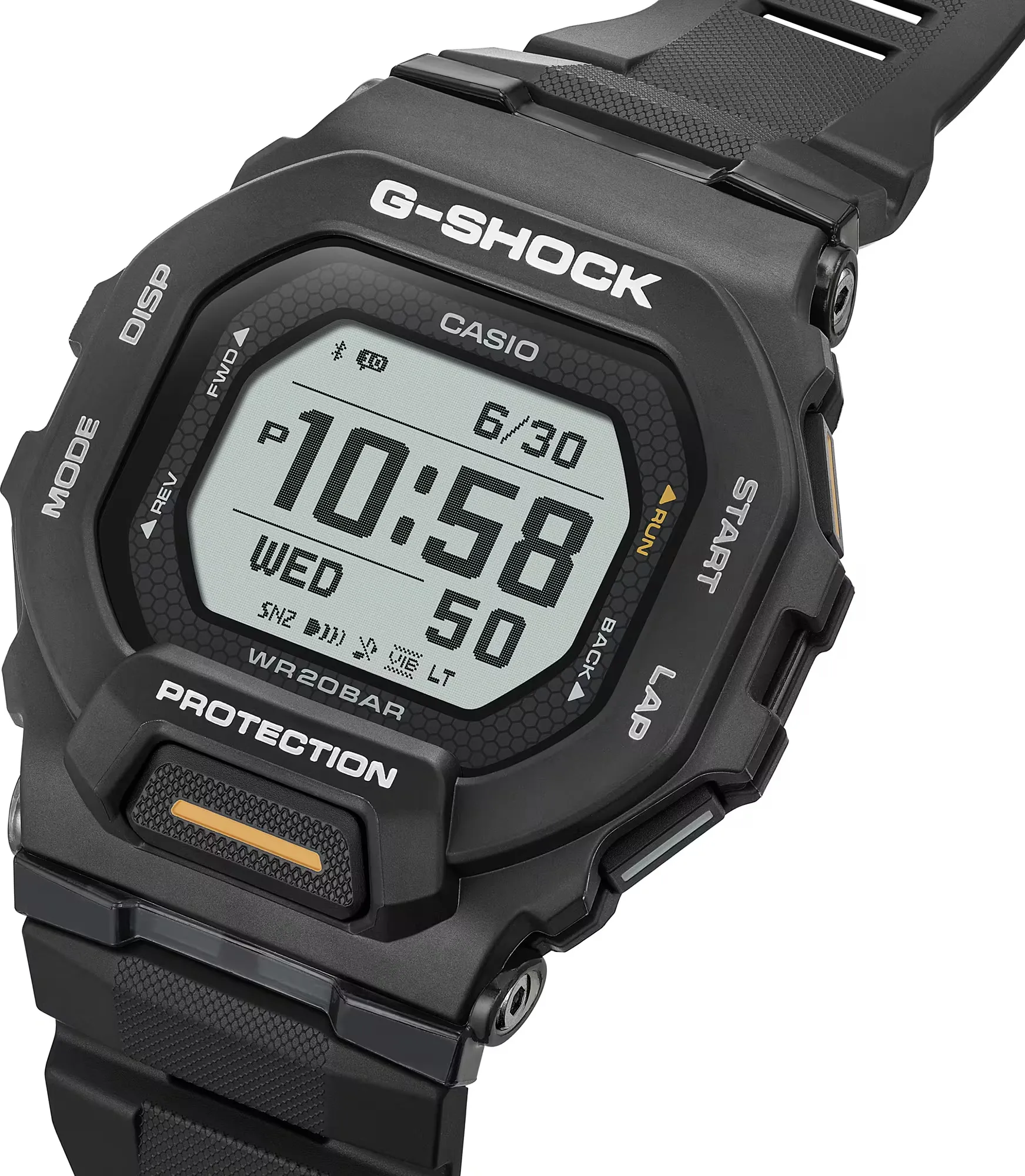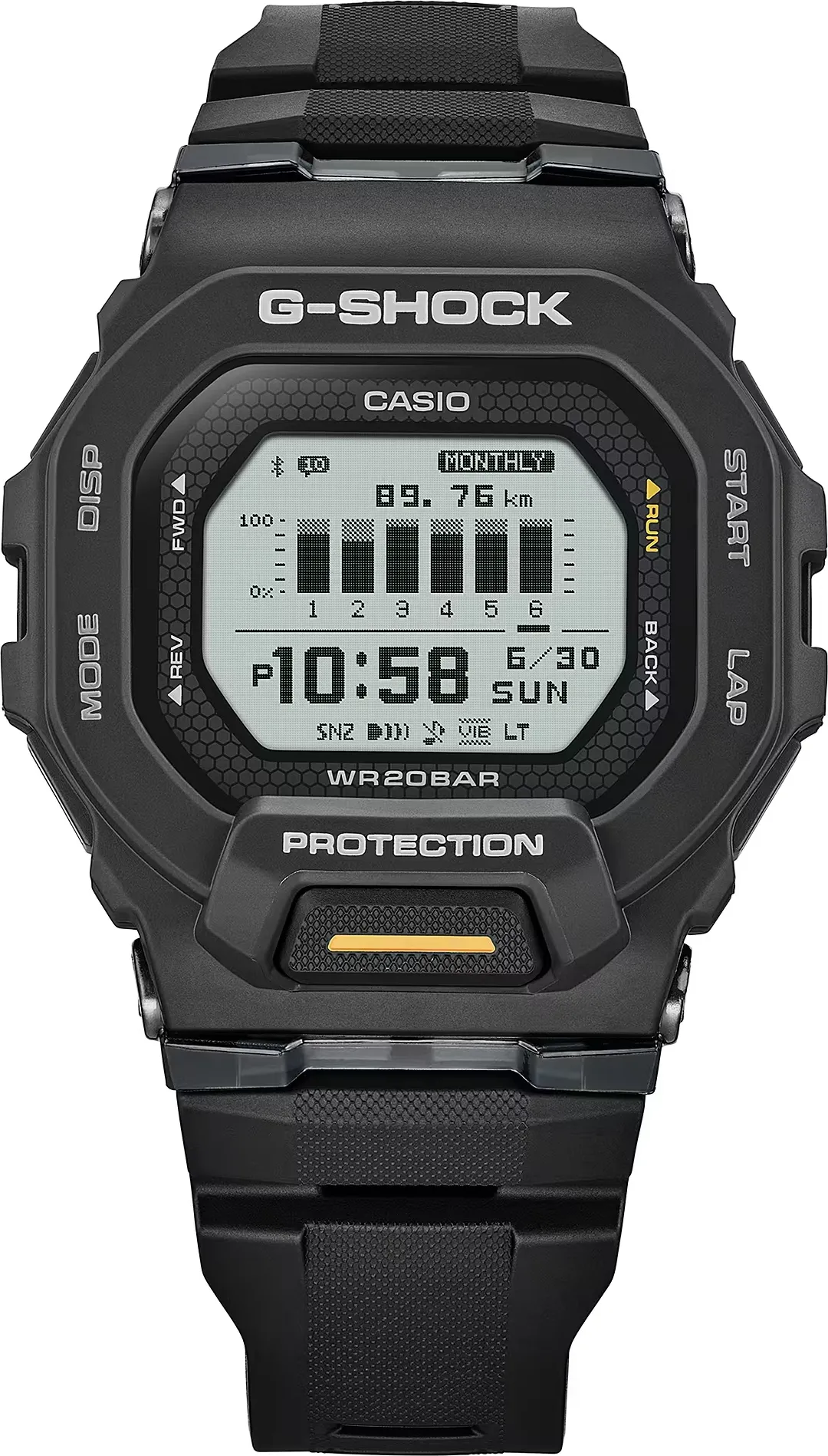 Мужские кварцевые наручные часы с цифровым отображением времени. Серия Casio G-Shock G-Squad. Часы оснащены шагомером и возможностью подключения к смартфону через Bluetooth® Smart, что позволяет вести учет физической активности и управлять настройками из приложения G-SHOCK Move®. Противоударный корпус защищает механизм часов от ударов и вибрации. Часы оснащены беспроводной технологией Bluetooth® со сверхнизким потреблением энергии для синхронизации со смартфоном. При подключении к смартфону часы корректируют текущее время, дату и мировое время и получают доступ к ряду полезных функций. Светодиодная автоматическая подсветка с выбираемой длительностью свечения 1,5 или 3 секунды. Функция автоподсветки - при недостаточной освещенности поворот руки включит подсветку часов. Функция поиска телефона. Функция виброуведомлений. Функция энергосбережения -дисплей гаснет для экономии энергии на 3 часа каждый день. Шагомер (подсчет шагов с помощью 3-осевого акселерометра) - измеряет и отображает от 0 до 99 999 шагов. Акселерометр - датчик движения реагирует на ускорение, а затем отображает полученные данные на экране дисплея. Кроме того, датчик поддерживает функцию автоматического поворота часов, гарантируя, что изображение на экране всегда будет иметь нужную ориентацию. Журнал тренировки: до 100 записей, каждая из которых содержит до 140 результатов тренировки (прошедшее время, пройденная дистанция, скорость, темп, количество сожженных калорий). Анализ и планировщик тренировок. Авиарежим - часы переключаются в режим оффлайн нажатием кнопки. С помощью этой функции можно отключить радио- и GPS-приемник на время перелета. Секундомер с точностью показаний 1 с временем измерения 100 часов. Режимы измерения: прошедшее время, промежуточное время. Память на 100 кругов. Таймер обратного отсчета от 1с до 1ч с автоповтором. Настройка времени работы 5 последовательных таймеров. Автоматический календарь до 2099 года. 12/24х часовой формат отображения времени. 4 ежедневных будильника, один с функцией повтора сигнала (Snooze). Мировое время - 38 городов (38 часовых поясов), всемирное координированное время (UTC), включение/отключение летнего времени. Включение/выключение звука кнопок. Корпус из полимерного пластика чёрного цвета. Размеры корпуса 48,4 мм на 45,9мм, толщина 15мм. Устойчивое к мелким механическим повреждениям минеральное стекло. Чёрный пластиковый ремешок с классической застёжкой buckle. Батарейка рассчитана на 2 года. Водонепроницаемость 200WR (часы подходят для плавания с маской, трубкой, обычного плавания). Вес около 58 г.