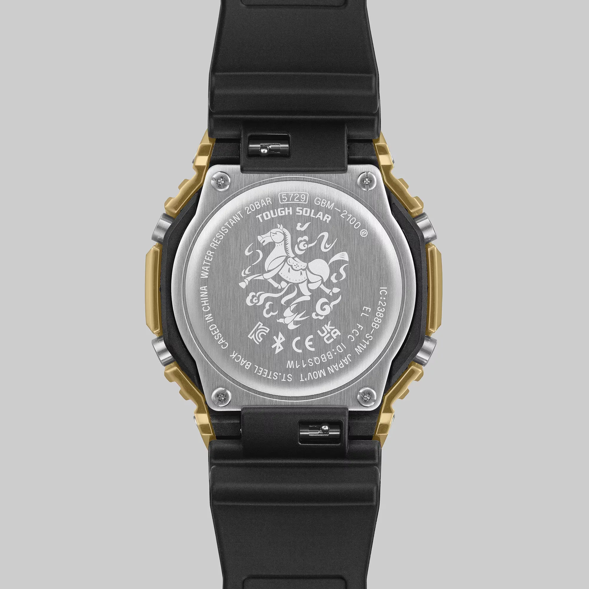 Мужские кварцевые наручные часы c аналого-цифровым отображением времени. Серия G-Shock limited. Модель посвящена 2026 году — году Лошади по восточному календарю. Силуэт лошади изображен на черном циферблате часов и выгравирован на задней крышке, а ее развивающаяся грива оставила свой след в виде гравировки на безеле. Противоударный корпус защищает механизм часов от ударов и вибрации. Питание от солнечной энергии (технология Tough Solar) - источником питания служит светочувствительная панель и аккумулятор, заряжаемый при попадании солнечного света на циферблат часов. Индикатор уровня заряда батареи. Функция автоматического сохранения энергии. Время работы аккумулятора без подзарядки около 7 месяцев, при включенной функции сохранения энергии около 18 месяцев. Двойная светодиодная подсветка обеспечивает подсветку не только аналогового циферблата, но и цифрового дисплея. Настраиваемое послесвечение 1,5 или 3 секунды. Светонакопительное покрытие стрелок обеспечивает длительное послесвечение в темноте после кратковременного воздействия света. 12-ти и 24-х часовой формат отображения времени. Секундомер с точностью измерения 1/100 секунды (в течение первого часа) и 1 секунда (через 1 час) и временем измерения 24часа. Режимы измерения: прошедшее время, время прохождения части и круга дистанции. Таймер обратного отсчета от 1с до 1часа с интервалом в 1 секунду. Мировое время – 38 городов (38 часовых поясов), всемирное координированное время (UTC). Функция включения/отключения летнего времени, переключение между домашним и мировым временем. Часы оснащены беспроводной технологией Bluetooth® со сверхнизким потреблением энергии для синхронизации со смартфоном. При подключении к смартфону часы автоматически корректируют текущее время и получают доступ к ряду полезных функций. Функция поиска телефона. Функция отключения/включения звука кнопок. Функция перемещения стрелок для удобного просмотра информации на цифровом дисплее. 5 ежедневных будильников, почасовой сигнал времени. Автоматический календарь до 2099 г. Чёрный циферблат с часовыми метками в виде золотистых штрихов. Устойчивое к мелким механическим повреждениям минеральное стекло. Восьмиугольный корпус со стальным безелем золотистого цвета. Размеры корпуса 49,3 мм на 44,4 мм, толщина 11,9 мм. Чёрный пластиковый ремешок с классической застежкой buckle. Водонепроницаемость 200 WR (часы подходят для плавания с маской, трубкой, обычного плавания). Вес около 72 г.