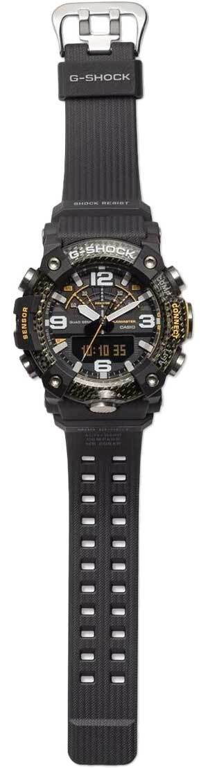Мужские кварцевые аналогово-цифровые наручные часы. Серия Casio G-Shock Mudmaster. Противоударный корпус с технологией Carbon Core Guard (усиленный углеродными волокнами пластик) , защищает механизм часов от ударов и вибрации. Защита от попадания внутрь пыли и грязи. Беспроводная технология Bluetooth® 4.0 со сверхнизким потреблением энергии для синхронизации со смартфоном. При подключении к смартфону часы корректируют текущее время. Приложение G-SHOCK Connected Phone позволяет создавать комбинации таймера и отправлять их на часы, хранить данные измерений секундомера. Специальное приложение G-SHOCK, упрощающее настройку часов, также включает новую функцию «Миссия». Приложение автоматически записывает данные о высоте, измеренные часами, и информацию о маршруте, полученную с помощью GPS на смартфоне. Двойная электролюминесцентная подсветка - одно нажатие кнопки обеспечивает подсветку не только цифрового дисплея, но и аналогового циферблата. Необритовое светонакопительное покрытие обеспечивает длительное послесвечение в темноте даже после кратковременного нахождения на свету. 12-ти и 24-х часовой формат времени. Время восхода и захода Солнца. Секундомер с точностью показаний 1/100 с и временем измерения 24 часа. Таймер обратного отсчета времени от 1 мин до 24 ч. Шагомер измеряет количество шагов от 0 до 999999. Высотомер - встроенный датчик барометрического давления с возможностью вывода результатов в единицах высоты над уровнем моря (до 10000 метров). Память данных высотометра до 40 записей. График набора высоты. Барометр - измерение атмосферного давления от 260 до 1100 гПа (от 195 до 825 мм рт ст). Встроенный датчик температуры от -10° до +60°С с точностью 0,1°C. Мировое время – 38 городов (38 часовых поясов), всемирное координированное время (UTC). Функция включения/отключения летнего времени. Цифровой компас. Диапазон измерения от 0° до 359° с точностью 1°. Функция поиска телефона. Функция перемещения стрелок Функция отключения/включения звука кнопок. Автоматический календарь. 5 ежедневных будильников, один с функцией Snooze (повтора сигнала), ежечасный сигнал. Индикатор низкого уровня заряда аккумулятора. Усиленный углеродными волокнами пластиковый корпус. Безель состоит из трех слоев тонкого пластика со вставкой из углеродного волокна. Верхний слой прозрачный, в результате чего видно карбоновую прослойку. Двойная задняя крышка: стальная закрывает механизм, а поверх неё закреплена пластина из ударопрочного тонкого пластика. Ремешок из полимерного пластика.