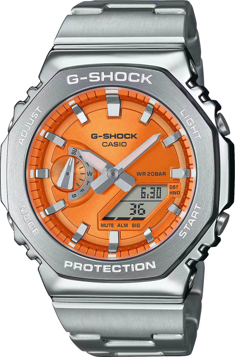 Мужские кварцевые аналого-цифровые наручные часы. Серия G-Shock. Противоударный корпус из нержавеющей стали и полимерного пластика защищает механизм часов от ударов и вибраций. Двойная светодиодная подсветка обеспечивает подсветку не только цифрового дисплея, но и аналогового циферблата. Настройка продолжительности подсветки 1,5 или 3 секунды, послесвечение. Светящееся покрытие стрелок обеспечивает длительное послесвечение в темноте после непродолжительного воздействия света. Оранжевый циферблат с часовыми метками в виде штрихов. 12-ти и 24-х часовой формат отображения времени. Секундомер с точностью показаний 1/100 с (первый час) и 1 с (после первого часа) и временем измерения 24 часа. Режимы измерения: прошедшее время, промежуточное время, два финишных результата. Таймер обратного отсчета от 1 секунды до 24 часов (с интервалом в 1 секунду) с автоповтором. Мировое время - 31 часовой пояс (48 городов), всемирное координированное время (UTC), включение/отключение летнего времени. 5 ежедневных будильников, ежечасный сигнал. Функция перемещения стрелок для удобного просмотра информации на цифровом экране. Ретроградный стрелочный указатель дня недели (дополнительный циферблат в положении 9 ч). Функция отключения/включения звука кнопок. Автоматический календарь до 2099 года. Восьмиугольный корпус серебристого цвета из нержавеющей стали и полимерного пластика. Размер корпуса 44,4 мм на 49,3мм, толщина 11,8мм. Устойчивое к мелким механическим повреждениям минеральное стекло. Стальной браслет с тройной раскладывающейся застежкой. Примерный срок службы батареи 3 года. Водонепроницаемость 200WR (плавание и ныряние без акваланга). Вес около 146 г.