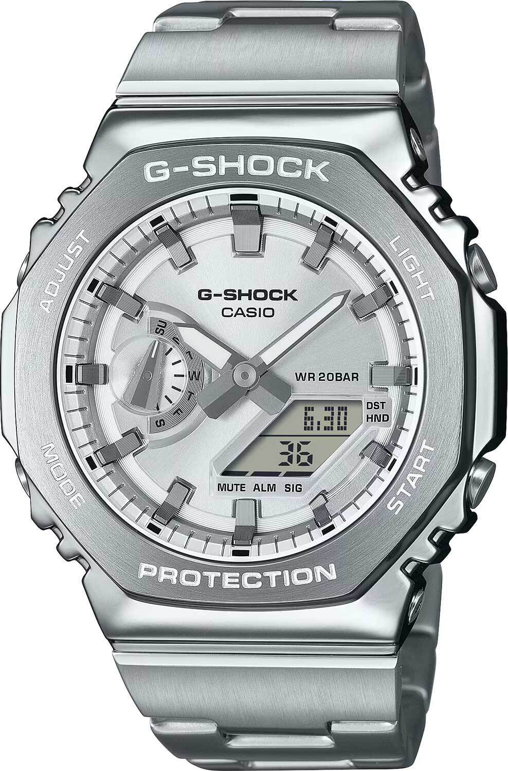 Мужские кварцевые аналого-цифровые наручные часы. Серия G-Shock. Противоударный корпус из нержавеющей стали и полимерного пластика защищает механизм часов от ударов и вибраций. Двойная светодиодная подсветка обеспечивает подсветку не только цифрового дисплея, но и аналогового циферблата. Настройка продолжительности подсветки 1,5 или 3 секунды, послесвечение. Светящееся покрытие стрелок обеспечивает длительное послесвечение в темноте после непродолжительного воздействия света. Серебристый циферблат с часовыми метками в виде штрихов. 12-ти и 24-х часовой формат отображения времени. Секундомер с точностью показаний 1/100 с (первый час) и 1 с (после первого часа) и временем измерения 24 часа. Режимы измерения: прошедшее время, промежуточное время, два финишных результата. Таймер обратного отсчета от 1 секунды до 24 часов (с интервалом в 1 секунду) с автоповтором. Мировое время - 31 часовой пояс (48 городов), всемирное координированное время (UTC), включение/отключение летнего времени. 5 ежедневных будильников, ежечасный сигнал. Функция перемещения стрелок для удобного просмотра информации на цифровом экране. Ретроградный стрелочный указатель дня недели (дополнительный циферблат в положении 9 ч). Функция отключения/включения звука кнопок. Автоматический календарь до 2099 года. Восьмиугольный корпус серебристого цвета из нержавеющей стали и полимерного пластика. Размер корпуса 44,4 мм на 49,3мм, толщина 11,8мм. Устойчивое к мелким механическим повреждениям минеральное стекло. Стальной браслет с тройной раскладывающейся застежкой. Примерный срок службы батареи 3 года. Водонепроницаемость 200WR (плавание и ныряние без акваланга). Вес около 146 г.