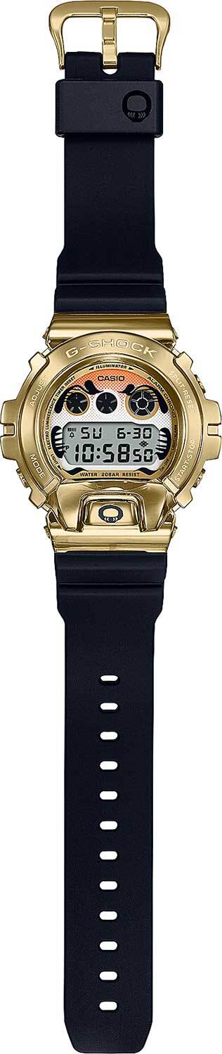 Мужские кварцевые электронные часы. Коллекция G-Shock Daruma Tumbler (limited). Часы выпущены ограниченным тиражом. Модель вдохновлена куклой Дарума. Дарума - японская традиционная кукла-неваляшка, олицетворяющая Бодхидхарму, в японской мифологии божество, приносящее счастье. Дарума используется в ежегодном новогоднем ритуале загадывания желаний. Дизайн циферблата полностью отражает лицо Бодхидхармы. Также в гравировке на задней крышке часов и при активации подсветки использованы узоры Бодхидхармы. Золотистый корпус символизирует богатство и процветание. Противоударный корпус защищает механизм часов от ударов и вибрации. Электролюминесцентная подсветка освещает весь дисплей, функция послесвечения. Световой сигнал (LED-индикатор) - светодиодная лампочка мигает при сигнале будильника, окончании таймера обратного отсчета или секундомера. Секундомер с точностью показаний 1/100 секунды (первый час), 1 секунда (через 1 час) и временем измерения 24 часа. Режимы измерения: прошедшее время, промежуточное время, два финишных результата. Таймер обратного отсчета от 1 секунды до 24 часов с автоповтором. 12-ти и 24-х часовой формат отображения времени. Многофункциональный будильник, ежедневный звуковой сигнал, индикация начала часа. Автоматический календарь до 2099 г. Круглый корпус из полимерного пластика и нержавеющей стали с покрытием цвета жёлтого золота. Размер корпуса 49,7 мм на 53,9 мм , толщина 18,6 мм. Чёрный пластиковый ремешок с классической застежкой buckle. Минеральное стекло устойчивое к мелким механическим повреждениям. Водостойкость WR 200 (плавание и ныряние без акваланга). Вес примерно 67 г. К часам прилагается шкатулка с японской настольной игрой Го. Часы в подарочной упаковке, разработанной токийской маркой BlackEyePatch.