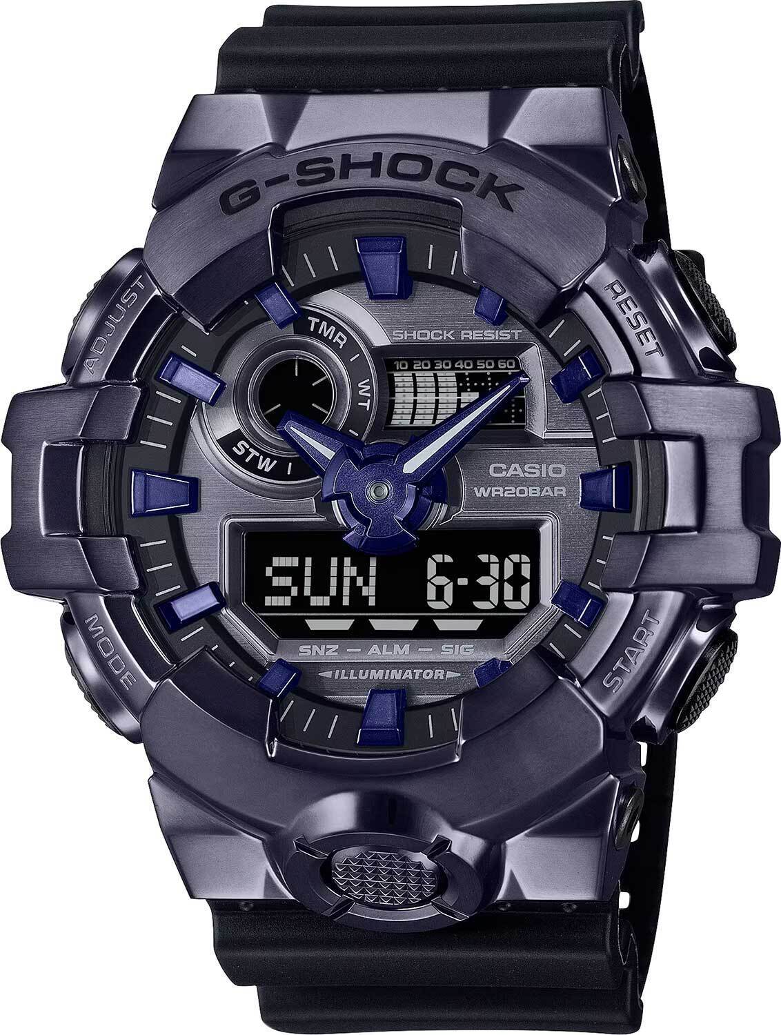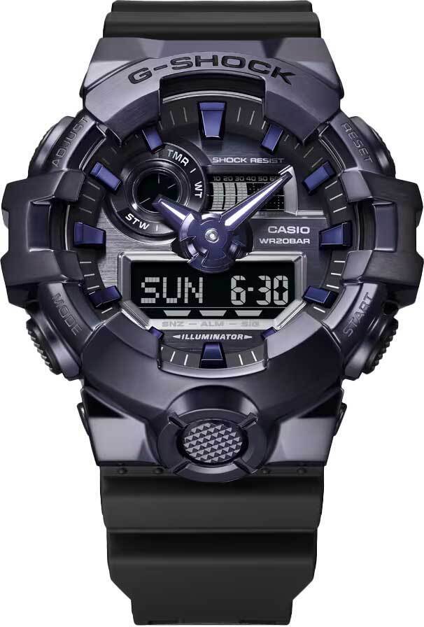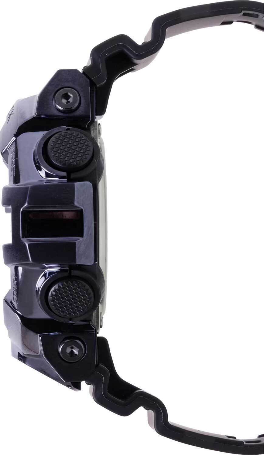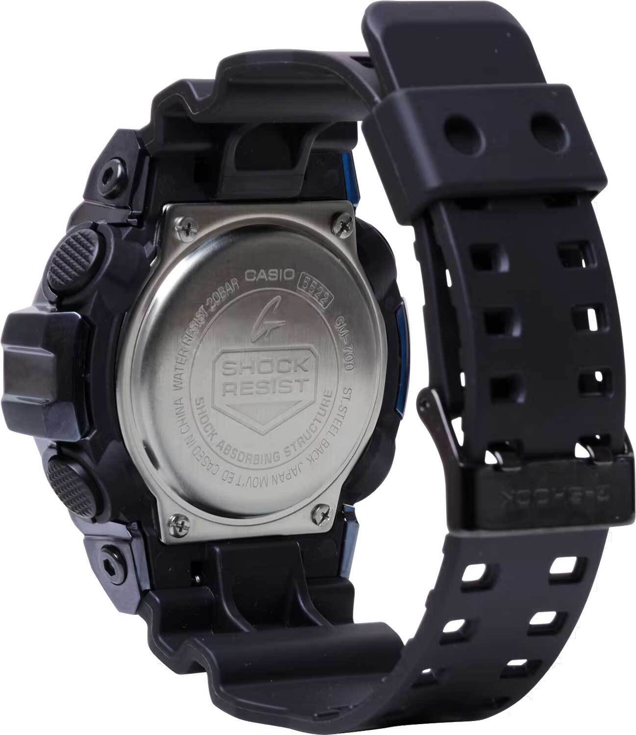Мужские кварцевые аналого-цифровые наручные часы. Серия G-Shock G-Steel. Ударопрочная конструкция корпуса защищает механизм часов от ударов и вибрации. Циферблат подсвечивается светодиодом, настройка продолжительности подсветки 1,5 или 3 секунды, послесвечение. 12-ти и 24-х часовой формат отображения времени. Секундомер с точностью показаний 1/100 секунды и временем измерения 24 ч. Режимы измерения: прошедшее время, промежуточное время, два финишных результата. Таймер обратного отсчета от 1 мин до 1 ч. Мировое время – 48 городов (31 часовой пояс), всемирное координированное время (UTC), включение/отключение летнего времени, переключение между домашним и мировым временем. Функция отключения/включения звука кнопок. Автоматический календарь до 2099 г. 5 ежедневных будильников, один с функцией Snooze (повтор сигнала), ежечасный сигнал. Функция перемещения стрелок для удобного просмотра информации на цифровом экране. Устойчивое к мелким механическим повреждениям минеральное стекло. Корпус из полимерного пластика со стальным безелем чёрного цвета. Размеры корпуса 58,4 мм на 53,4мм, толщина 18,6мм. Чёрный пластиковый ремешок с классической застёжкой buckle. Батарейка рассчитана на 5 лет. Водозащита 200WR (плавание и ныряние без акваланга). Вес около 111 г.