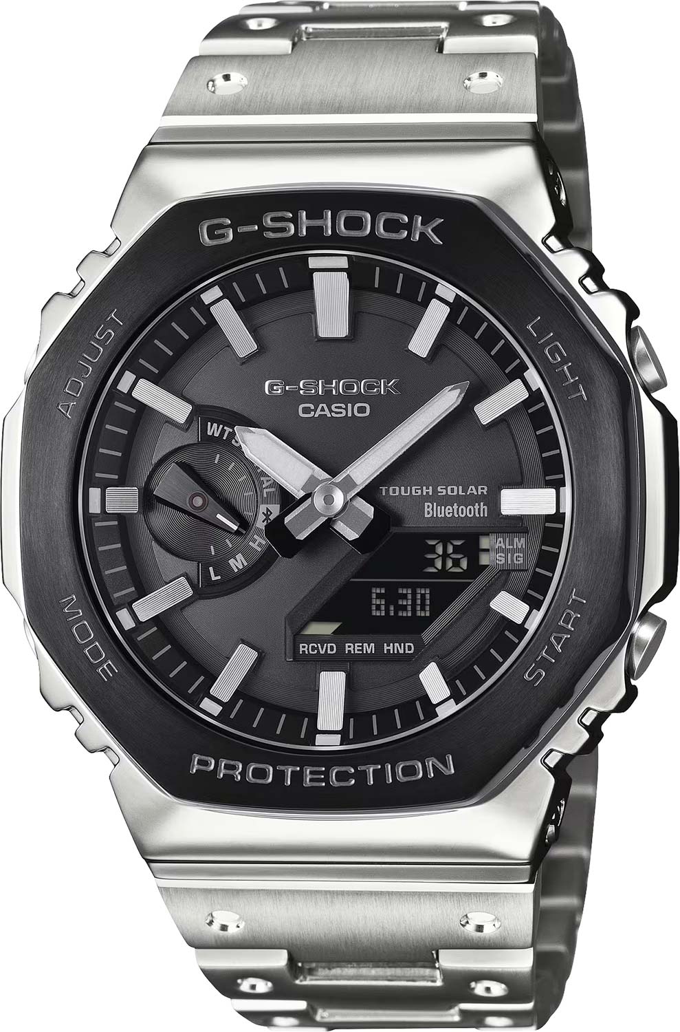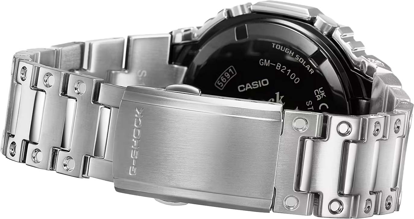 Мужские кварцевые наручные часы с аналогово-цифровым отображением времени. Серия G-Shock. Данная модель собирается только в Японии на производстве Casio в Ямагата. Противоударный корпус защищает механизм часов от ударов и вибрации. Модуль часов снабжен элементами из материала alphaGEL, который еще лучше защищает часы от сотрясения и вибрации. АlphaGEL представляет собой гибкую силиконовую прослойку, оказывающую амортизирующий эффект. Питание от солнечной энергии (технология Tough Solar) - источником питания служит светочувствительная панель и аккумулятор, заряжаемый при попадании солнечного света на циферблат часов. Индикатор уровня заряда батареи. Функция автоматического сохранения энергии. Время работы аккумулятора без подзарядки около 7 месяцев, при включенной функции сохранения энергии около 18 месяцев. Двойная светодиодная подсветка обеспечивает подсветку не только аналогового циферблата, но и цифрового дисплея. Настраиваемое послесвечение 1,5 или 3 секунды. Светонакопительное покрытие стрелок обеспечивает длительное послесвечение в темноте после кратковременного воздействия света. 12-ти и 24-х часовой формат отображения времени. Секундомер с двумя точностью показаний 1/100 секунды (в течение первого часа), 1 секунда (через 1 час) и временем измерения 24 часа. Режимы измерения: прошедшее время, время прохождения части и круга дистанции. Таймер обратного отсчета от 1 секунды до 1часа с шагом в 1 секунду. Сигнал оповещения об окончании обратного отсчета звучит в течение 10 секунд. Мировое время – 38 городов (38 часовых поясов), всемирное координированное время (UTC). Функция включения/отключения летнего времени. Переключение между домашним и мировым временем. Часы оснащены беспроводной технологией Bluetooth® со сверхнизким потреблением энергии для синхронизации со смартфоном. При подключении к смартфону часы автоматически корректируют текущее время, в том числе переход на зимнее/летнее время, копируют настройки мирового времени более чем для 300 городов и получают доступ к ряду полезных функций. Функция поиска телефона. Функция отключения/включения звука кнопок Функция перемещения стрелок для удобного просмотра информации на цифровом дисплее. 5 ежедневных будильников, почасовой сигнал времени. Автоматический календарь до 2099 г, отображение дней недели на шести языках. Чёрный циферблат с часовыми метками в виде штрихов. Устойчивое к мелким механическим повреждениям минеральное стекло. Восьмиугольный корпус из нержавеющей стали с чёрным IP покрытием на безеле. Размеры корпуса 59,8 мм на 44,4 мм, толщина 12,8 мм. Стальной браслет с тройной раскладывающейся застежкой. Задняя крышка с винтовым фиксатором. Водонепроницаемость 200 WR (часы подходят для плавания с маской, трубкой, обычного плавания). Вес около 165 г.
