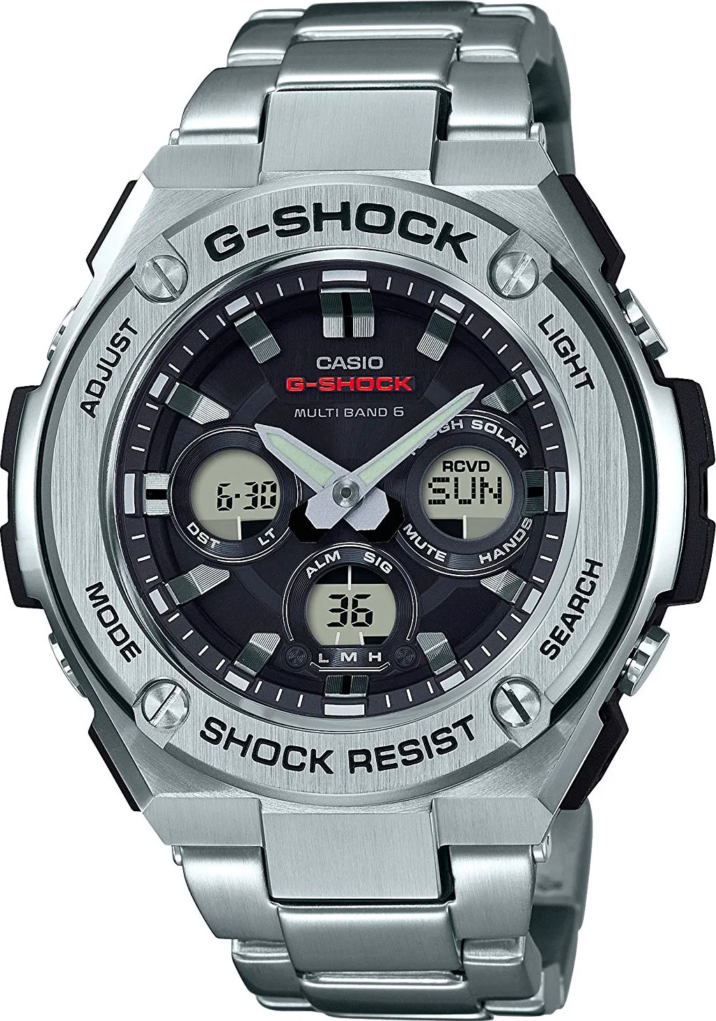 Мужские кварцевые наручные часы с аналого-цифровым отображением времени. Серия Casio G-Shock G-Steel. Противоударный корпус защищает механизм часов от ударов и вибрации. Питание от солнечной энергии (технология Tough Solar) - источником питания служит светочувствительная панель и аккумулятор, заряжаемый при попадании солнечного света на циферблат часов. Индикатор низкого заряда батареи. Функция энергосбережения. Время работы без подзарядки в обычном режиме около 7 месяцев, в режиме энергосбережения приблизительно 18 месяцев. Двойная автоматическая светодиодная подсветка с возможностью выбора продолжительности освещения 1.5 или 3 секунды - одновременно подсвечивается аналоговый циферблат и цифровой дисплей. При недостаточном освещении поворот руки обеспечит автоматическое включение подсветки. Светонакопительное необритовое покрытие стрелок обеспечивает длительное послесвечение в темноте после кратковременного воздействия света. Технология Multi Band 6 позволяет принимать сигналы от шести радиовышек, расположенных в различных точках земного шара, которые передают временные сигналы от определенных атомных часов. Коррекция текущего времени радиосигналом на территории почти всей Европы, США, Японии и Китая. Таймер обратного отсчета от 1 минуты до 100 минут. Мировое время - 31 часовая зона (48 городов), всемирное координированное время (UTC). Функция включения/отключения летнего времени. 12/24-х часовой формат отображения времени. Секундомер с точностью показаний 1/100 секунды и временем измерения 1 час. Режимы измерения: прошедшее время, промежуточное время, два финишных результата. 5 ежедневных будильников, один с функцией повтора сигнала Snooze, ежечасный сигнал. Автоматический календарь до 2099 года. Функция включения/отключения звука кнопок. Функция перемещения стрелок для удобного просмотра информации на цифровом экране. Круглый двухслойный корпус - между слоями стали, в качестве амортизирующей прокладки, выступает полимерный пластик. Размеры корпуса 49,3 мм на 55,9 мм, толщина 15,3 мм. Устойчивое к мелким механическим повреждениям минеральное стекло. Стальной браслет с раскладывающейся застёжкой. Водонепроницаемость 200WR (плавание и погружение без акваланга). Вес около 183 г.