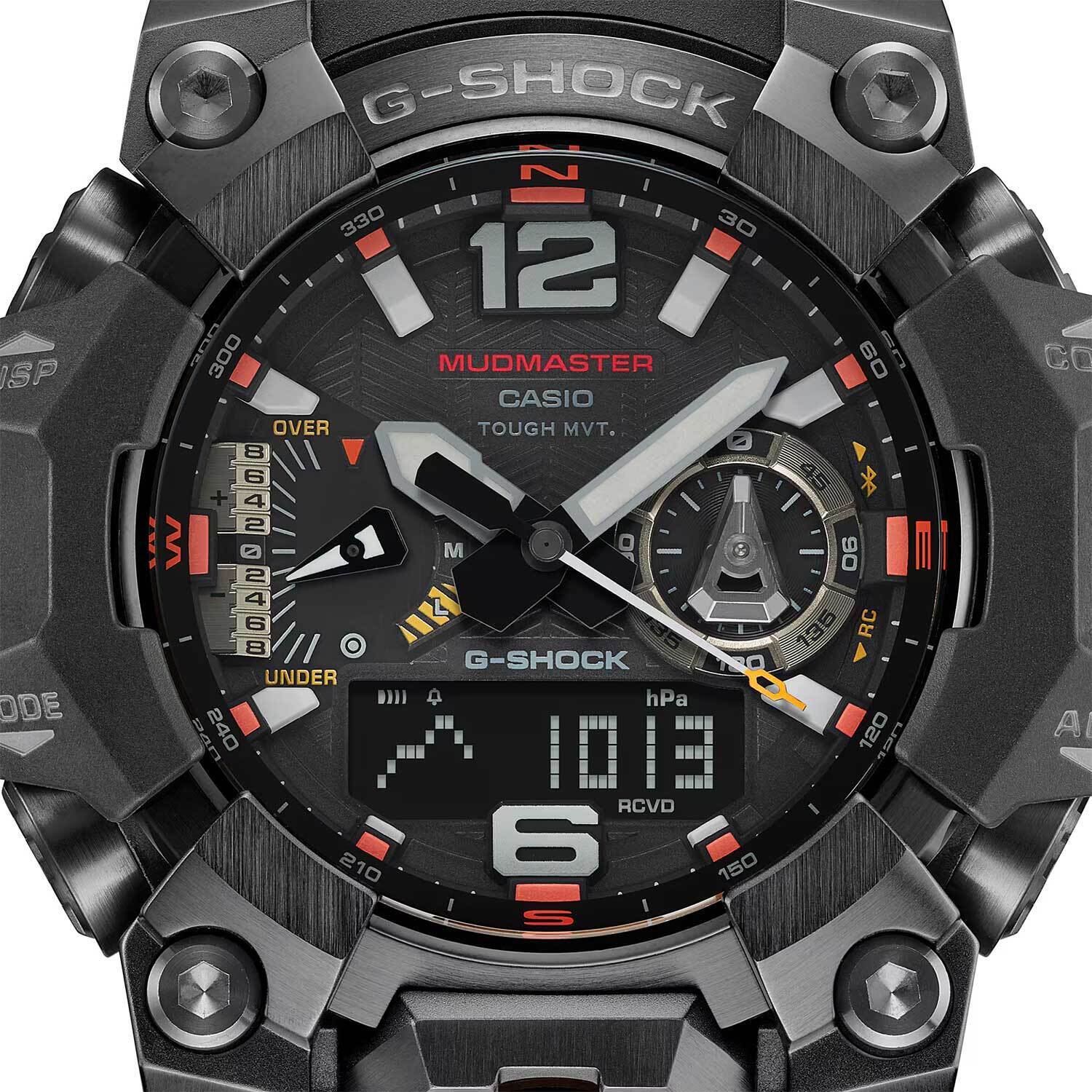 Мужские кварцевые аналого-цифровые наручные часы на солнечной батарее. Серия G-Shock Master Of G Mudmaster. Ударопрочная конструкция защищает механизм часов от ударов и вибрации. Часы обладают грязеустойчивостью - особая конструкция предохраняет от попадание грязи и пыли внутрь часов. Устойчивость к воздействию магнитного поля - защитный модуль сохраняет электронику и исключает любые помехи в работе часов. Синхронизация со смартфоном по беспроводной технологии Bluetooth®. При подключении к смартфону часы корректируют текущее время (до 4 раз в день) и получают доступ к целому ряду полезных функций. Двойная автоматическая светодиодная подсветка - поворот руки при недостаточном освещении обеспечит включение подсветки циферблат и ЖК-дисплея. Светонакопительное покрытие стрелок обеспечивает длительное послесвечение в темноте после кратковременного воздействия света. Питание от солнечной энергии (технология Tough Solar) - источником питания служит светочувствительная панель и аккумулятор, подзаряжаемый при попадании солнечного света на циферблат часов. Прием радиосигнала (Европа, США, Япония, Китай) для корректировки точности времени. Система Smart Access с помощью переводной головки обеспечивает простой и удобный доступ ко всем важным функциям часов - нажатие или поворот переводной головки позволяет переключаться между различными режимами и активировать будильник, таймер, секундомер, а также настраивать функцию мирового времени. Секундомер с точностью показаний 1/100 с и временем измерения 24 часа. Режимы измерения: прошедшее время, промежуточное время, два финишных результата. Таймер обратного отсчёта от 1 минуты до 60 минут с автоповтором. Барометр - специальный датчик измеряет давление воздуха от 260 до 1100 гПа (от 195 до 825 мм рт. ст.) и отображает измеренное значение на экране в виде символа. Термометр - датчик измеряет температуру окружающего воздуха вокруг часов и отображает ее на экране в градусах °C (-10°C /+60°C). Цифровой компас. Диапазон измерения от 0° до 359° с точностью 1°. Двунаправленная калибровка и коррекция магнитного склонения. Высотомер (альтиметр) - встроенный датчик давления определяет изменения в атмосферном давлении и преобразовывает полученные результаты в абсолютную высоту до 10 000 м.. График набора высоты. Память данных высотомера —в записной книжке хранятся данные о результатах измерений, выполненных в режиме высотомера. Отображение времени восхода и захода солнца для определенной даты. Индикатор местоположения указывает направление и расстояние до ранее сохраненного местоположения. Функция мирового времени - 38 часовых поясов (55 городов), всемирное координированное время, включение/выключение летнего времени, автоматическое переключение на летнее время (DST), переключение местного на мировое время. 5 ежедневных будильников, сигнал начала часа. Функция автоматической настройки положения стрелок проверяет исходное положение стрелок каждый час и корректирует его в случае необходимости (изменение после удара, либо из-за влияния магнитного поля). Включение/выключение звука кнопок. Функция перемещения стрелок для удобного просмотра информации на цифровом экране. Функция поиска телефона. Автоматический календарь до 2099 года. 12/24-х часовой формат отображения времени. Индикатор уровня заряда аккумулятора. Функция энергосбережения